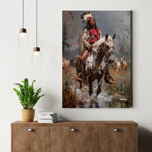 Sunset Symphony Warrior's Ride to the Melody of Falling Waters Native American Horse Canvas