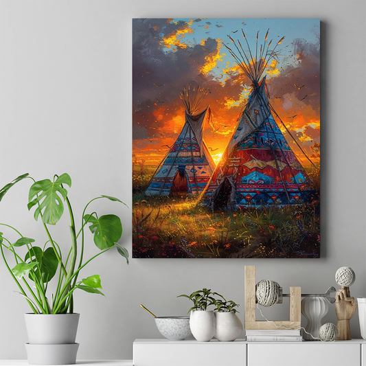 Sunset Serenity: Painted Tipis in Twilight Native American Canvas