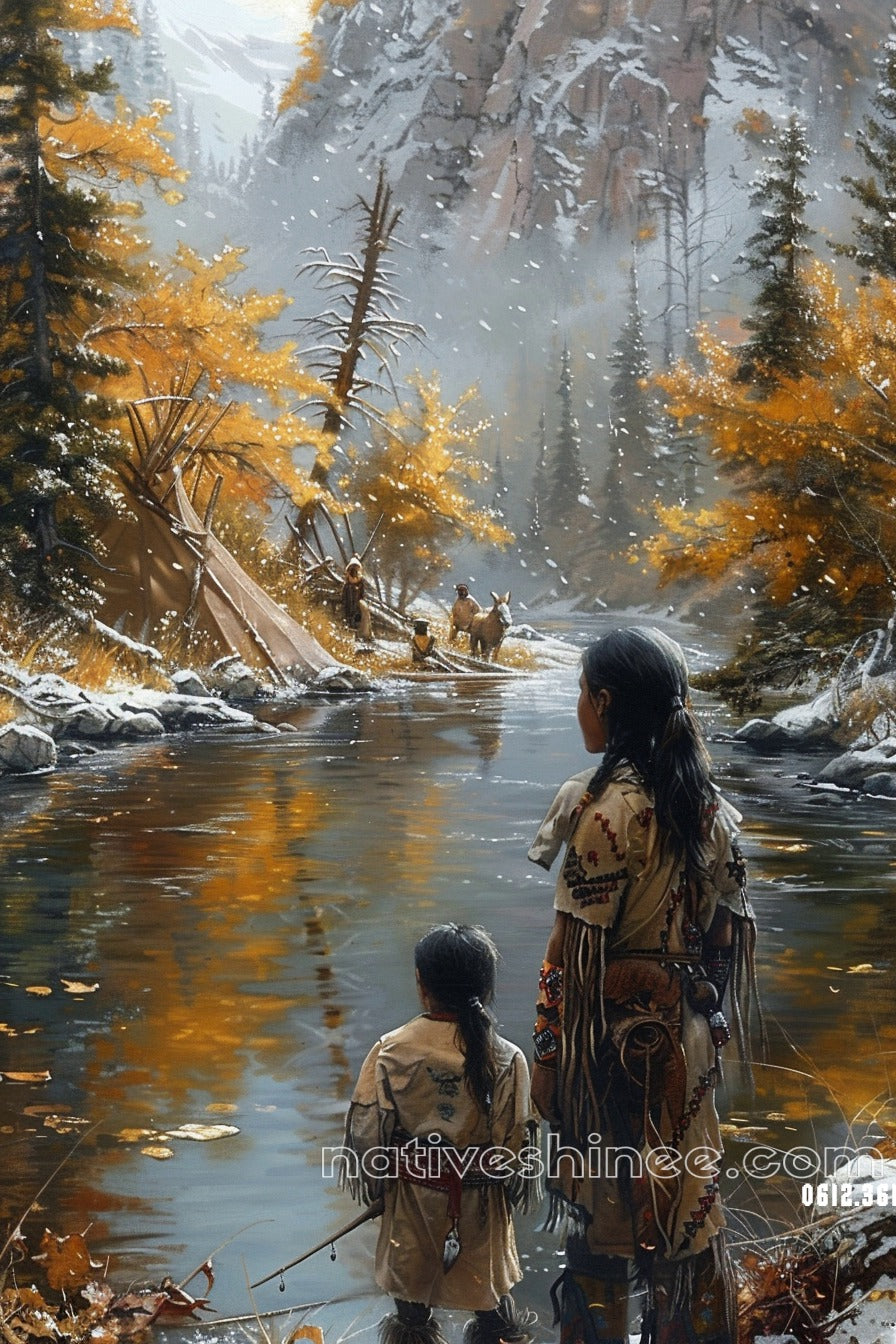 This stunning image captures a mother and child standing side by side, gazing at the peaceful river before them. Both are adorned in traditional Native American attire, symbolizing the deep cultural roots passed down through generations. The mother’s protective stance and the child’s innocent curiosity reflect the bond between them, anchored in a shared legacy. In the background, the serene landscape features snow-dusted trees with a warm glow from the golden light peeking through the mountains. The atmosphere is calm and reflective, with hints of the autumn season and the timeless connection to nature that is central to their way of life. The distant figures and animals reflect the community's harmony with the environment.