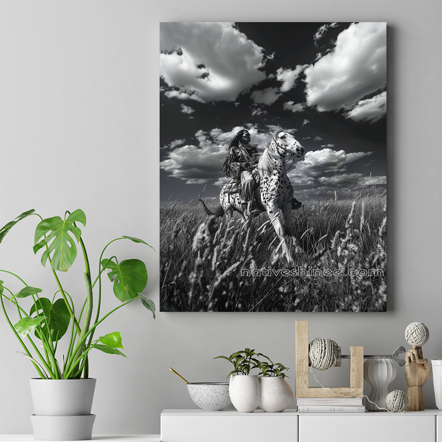 The "A Native American's Ride Through History Horse Canvas" showcases a powerful image of a Native American riding horseback, symbolizing strength, freedom, and a deep connection to history. This stunning artwork highlights the rich cultural heritage and enduring spirit of indigenous people. With its dynamic composition and vibrant colors, it’s an eye-catching addition to any living room, office, or study. Perfect for those who admire Native American culture and art, this high-quality canvas adds both inspiration and beauty to your space, celebrating tradition and the timeless bond between people and nature.
