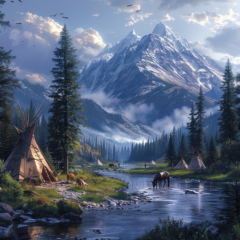 The "A Peaceful Encampment Native American Horse Canvas" captures a serene scene of a Native American encampment, with horses resting calmly by the fire under a tranquil sky. This artwork reflects the harmony between the people, their horses, and the natural world, symbolizing peace, unity, and connection to the land. The warm tones and intricate details bring a sense of calm and tradition to any space. Ideal for those who appreciate Native American culture, this high-quality canvas adds a touch of serenity and heritage to your home or office, celebrating the simplicity and beauty of life in nature.
