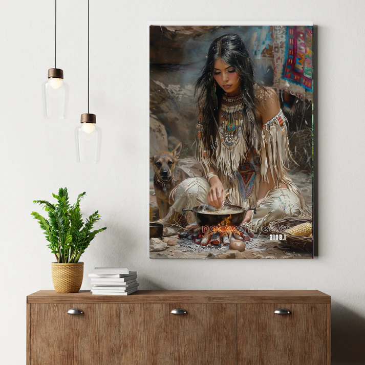 This canvas portrays a striking and bold scene of a Native American warrior standing atop a rocky mountain ridge in the afternoon. The warrior is adorned in traditional fringed buckskin attire with intricate beadwork, a feathered headdress, and a spear held firmly, exuding strength and vigilance. The sky is a vibrant blue with the sun high, casting a warm golden light over the rugged peaks and valleys below, where patches of greenery and distant forests are visible. The afternoon sunlight highlights the warrior's red facial markings and the texture of the terrain, creating a sense of enduring presence. The artwork is framed and displayed above a wooden cabinet, complemented by a potted plant and hanging pendant lights, creating a warm and inviting interior setting.