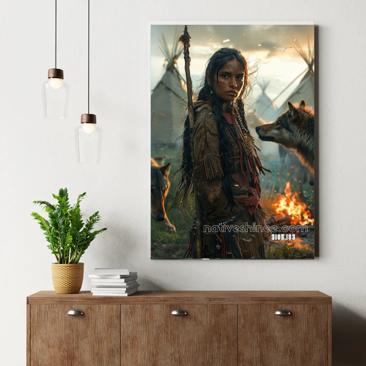 This sacred canvas portrays a Native American elder standing tall in the vast desert under a full moon’s gentle embrace, his silver hair and beaded robe with feather accents shimmering in the soft, silvery light. His raised hands and wise, weathered face reflect a deep communion with the spirits, while the moon illuminates the rolling dunes, sparse cacti, and scattered rocks, casting long shadows across the arid expanse. The sky above glows with a deep indigo, alive with countless stars, contrasting with the warm reds, yellows, and browns of his traditional attire. A distant teepee silhouette whispers of cultural roots, blending the elder’s presence with the wild, silent desert. The cool blues and grays of the sand harmonize with the vibrant hues of his clothing, evoking a timeless narrative of resilience, spirituality, and unity with the land. This artwork is a powerful tribute to indigenous wisdom, perfect for infusing any space with peace and cultural reverence.