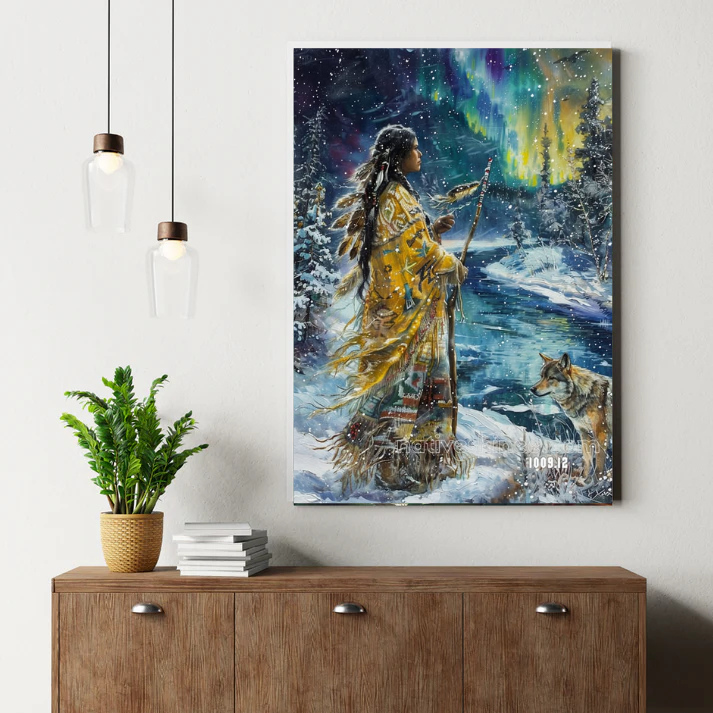 This mesmerizing canvas illuminates a poised Native American woman standing tall on a snow-swept riverbank beneath a celestial explosion of emerald and violet auroras dancing across the midnight sky, her golden fringed gown embroidered with intricate patterns billowing softly as she holds a ceremonial eagle feather toward a vigilant gray wolf at her side, their forms mirrored in the icy blue waters amid frost-laced pines. Rendered in luminous, ethereal oils with glowing spectral veils and crystalline textures, the artwork channels cosmic wonder, interspecies guardianship, and the quiet magic of northern solstice nights, a transcendent focal point for serene, starlit interiors.