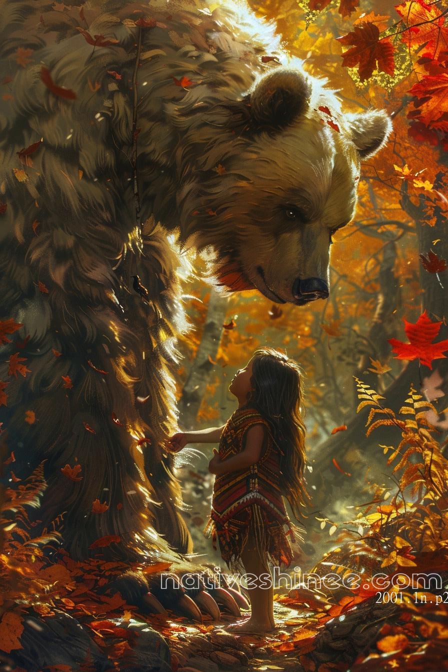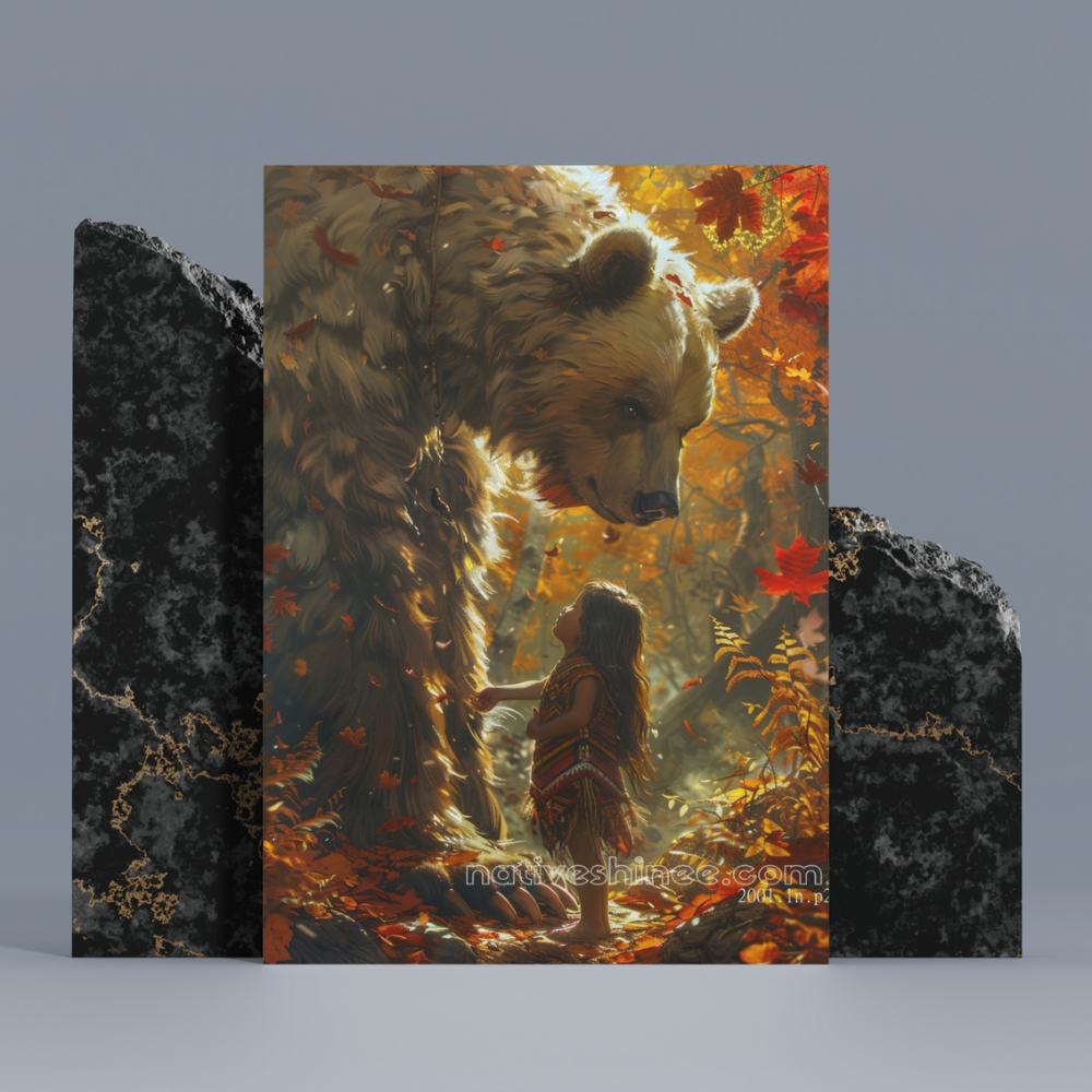 Celebrate the beauty of connection with the Autumn Harmony Native American Canvas, featuring a young Native American girl and a majestic bear sharing a tender moment in a golden autumn forest. The vibrant fall leaves and warm sunlight create a serene and enchanting scene that symbolizes unity, trust, and harmony with nature. This captivating artwork brings warmth, culture, and natural beauty to any space, making it a perfect addition to your home decor.