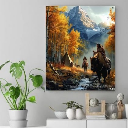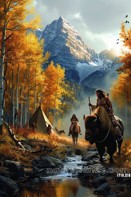 In the golden embrace of autumn, this breathtaking scene captures a Native American warrior leading a powerful bison through a tranquil stream, embodying resilience and harmony with nature. Towering aspen trees with fiery yellow leaves frame the scene, while a snow-capped mountain rises majestically in the background, symbolizing the steadfast spirit of the land. In the distance, other riders and a tipi stand under the gentle glow of the afternoon sun, conveying a sense of community and heritage. The clear reflections in the stream mirror the peaceful unity between humanity and wildlife, a timeless tribute to the beauty of living in rhythm with the earth.