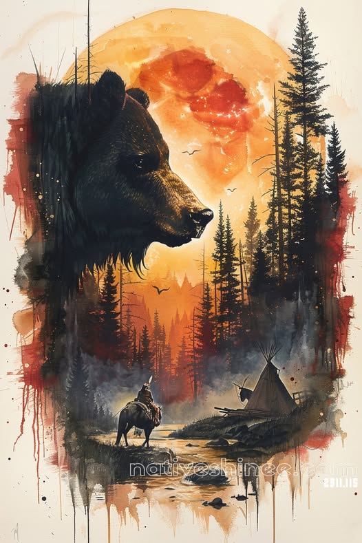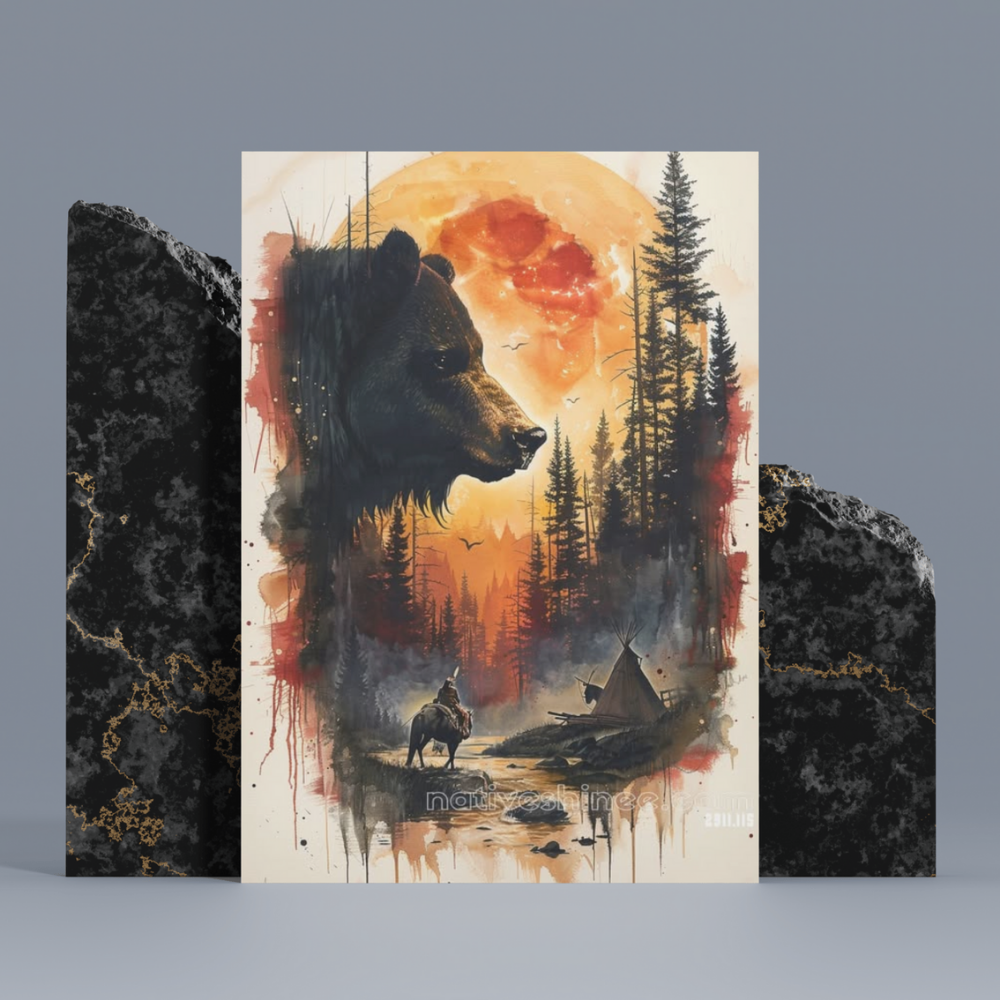 Immerse yourself in the raw beauty of nature with this Bear and Warrior canvas print. The artwork features a powerful bear looming over a serene landscape, with a Native American warrior riding through a tranquil forest, accompanied by a warm, glowing sunset. This stunning piece captures the profound connection between the warrior and the wilderness, showcasing the strength and wisdom of both the animal and human spirit. Perfect for those who appreciate the bond between nature and Native American culture, this canvas brings a sense of adventure and tranquility to any space.