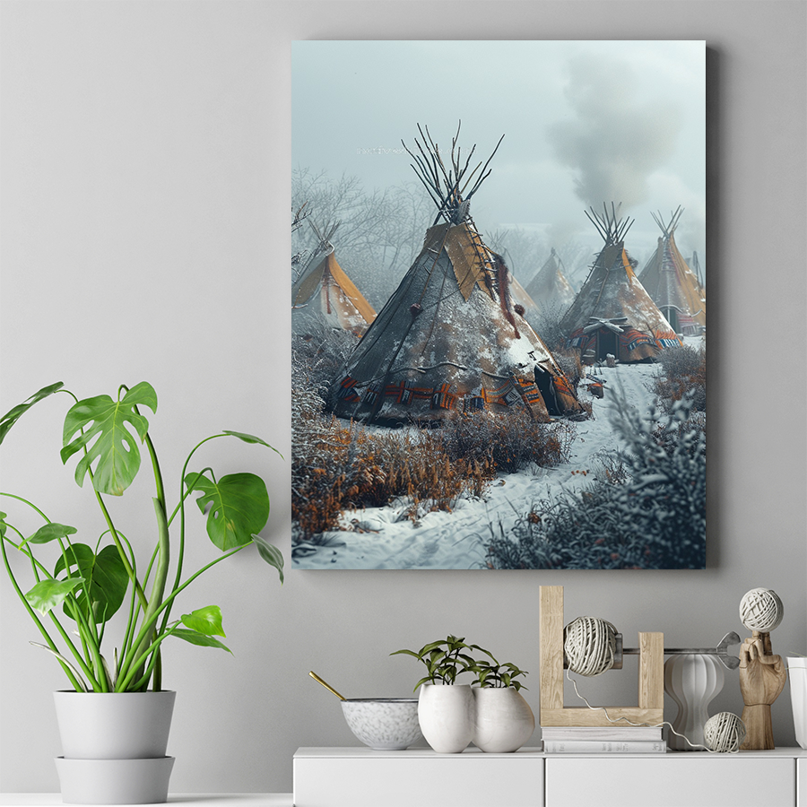 The "Beneath the Cold Sky, Warm Hearts Native American Canvas" beautifully contrasts the starkness of a cold, wintry landscape with the warmth of community and connection among Native American figures. This artwork symbolizes resilience, unity, and the strength of spirit that thrives even in the harshest conditions. With soft, muted colors and intricate detailing, it captures the essence of togetherness and the enduring bond between people and nature. Ideal for those who appreciate Native American culture and the themes of warmth and perseverance, this high-quality canvas adds both emotional depth and serenity to any space.