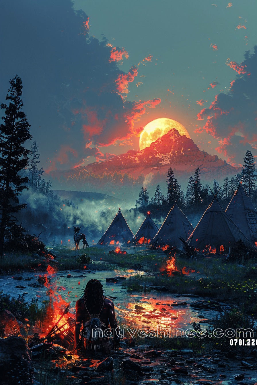 In this captivating scene, the rich orange glow of the setting sun meets the mystic light of a full moon, casting a sacred radiance over the landscape. A lone Native American figure sits by a crackling fire, his silhouette framed against the fiery sky. In the distance, a lone wolf stands watch, embodying the spirit of the wild. The teepees are softly illuminated by the flames, creating an atmosphere of tranquility and reverence for the earth and its creatures. This scene captures the harmonious connection between the people, the land, and the celestial forces above. It reflects a time when nature and spirit were intertwined in the everyday lives of Native American tribes. The peaceful presence of the figure by the fire invokes the ancient traditions of storytelling, prayer, and reflection, inviting the viewer into a moment of profound solitude and connection.