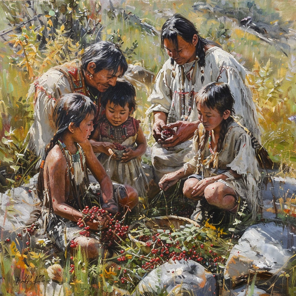 The "Berry Harvest Native American Canvas" beautifully depicts a vibrant scene of Native Americans gathering berries in a lush, natural setting. This artwork symbolizes the importance of nature, sustenance, and community in indigenous culture, celebrating the connection between people and the land. With rich colors and intricate details, it captures the joy and harmony of the harvest season. Perfect for those who appreciate Native American traditions and the beauty of nature, this high-quality canvas adds warmth and cultural significance to any space, inviting reflection on the timeless practices that sustain both body and spirit.