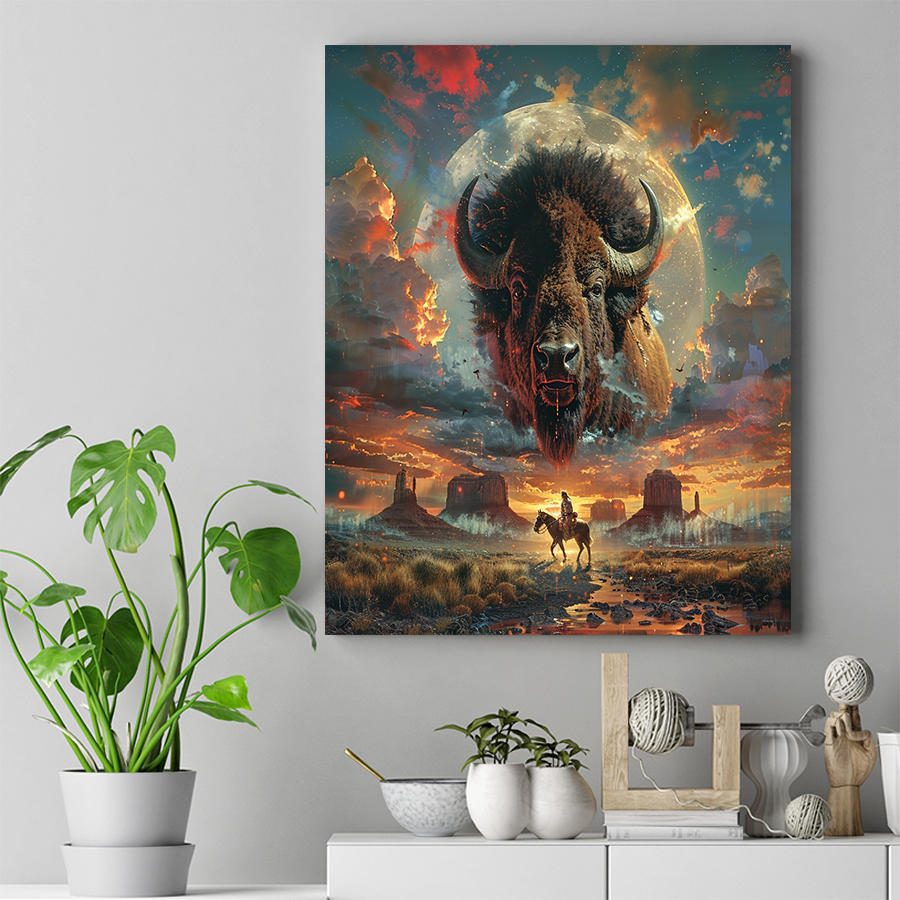 The "Bison Spirit of the Wild Native American Canvas" portrays the majestic bison as a powerful symbol of strength, endurance, and the untamed spirit of nature. This artwork captures the essence of the wild, showcasing the bison in its natural habitat, surrounded by the beauty of the open landscape. The rich colors and intricate details highlight the bison's significance in Native American culture as a provider and a spiritual guide. Ideal for those who appreciate indigenous heritage and the connection to the land, this high-quality canvas adds a sense of raw beauty and cultural depth to any home or office décor.