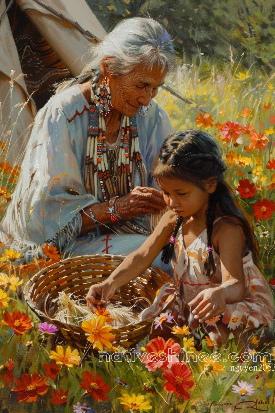The image showcases a person and a child joyfully exploring a vibrant flower garden, surrounded by lush plants and colorful blooms. Their clothing reflects cultural significance, enhancing the serene atmosphere of the outdoor setting. The scene captures tender moments of bonding amidst nature’s beauty, highlighting the importance of familial ties and appreciation for the natural world in a Native American context.