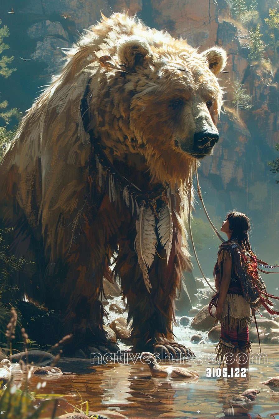This mesmerizing canvas artwork portrays a young Native American figure in traditional attire, gazing up in wonder at an enormous, majestic bear adorned with feathers and ropes, standing in a crystal-clear stream amidst towering cliffs and verdant forests. The scene captures a mythical harmony between human and beast, symbolizing protection, wisdom, and the untamed spirit of the wilderness, illuminated by dramatic, diffused light that adds a sense of epic fantasy. Displayed in a sleek modern interior with hanging lights, a vibrant potted plant, and a pile of books on a wooden sideboard, it seamlessly fuses legendary storytelling with everyday elegance.