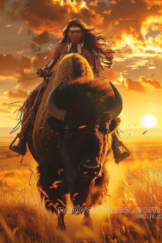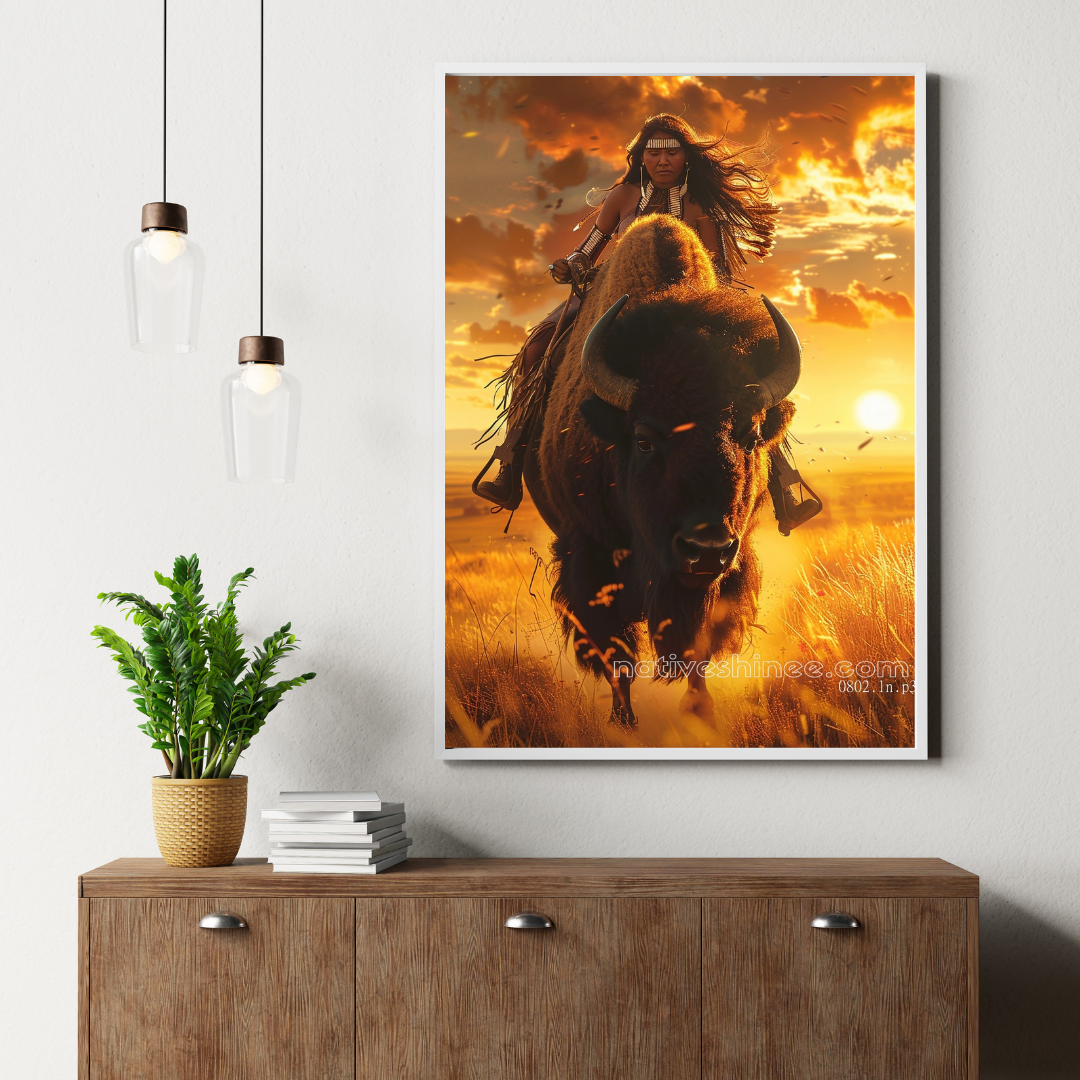Feel the power of the wild with this awe-inspiring canvas art, Buffalo Rider Spirit Native American Canvas. This breathtaking image showcases a Native American woman riding a mighty buffalo through the golden fields at sunset. The warrior’s composed expression and her traditional attire highlight her deep connection to the land and the animals that roam it. The buffalo, symbolizing strength and endurance, represents the spirit of the wilderness, while the vibrant sunset backdrop evokes a sense of freedom and determination. Perfect for anyone who honors Native American heritage and the untamed beauty of nature, this artwork is a stunning addition to any collection.