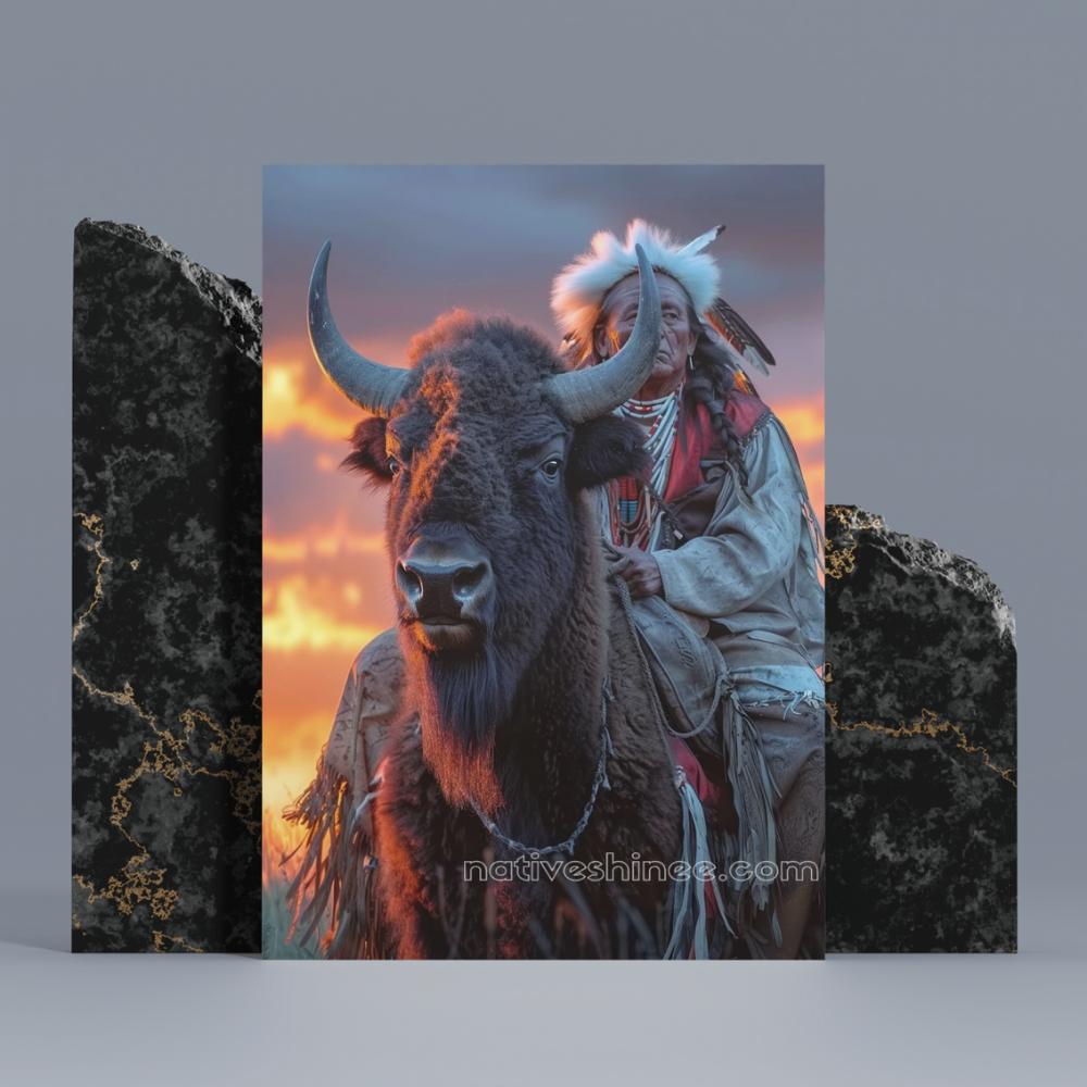 Bathed in the fiery glow of a vibrant sunset, this piece embodies the sacred bond between the Native American people and the buffalo, a symbol of survival and strength. The warrior, confidently riding atop this magnificent creature, symbolizes the enduring connection between humanity and nature. This canvas evokes the power and majesty of the great plains, making it an ideal addition to any collection that honors Native American heritage and the spirit of the wild.