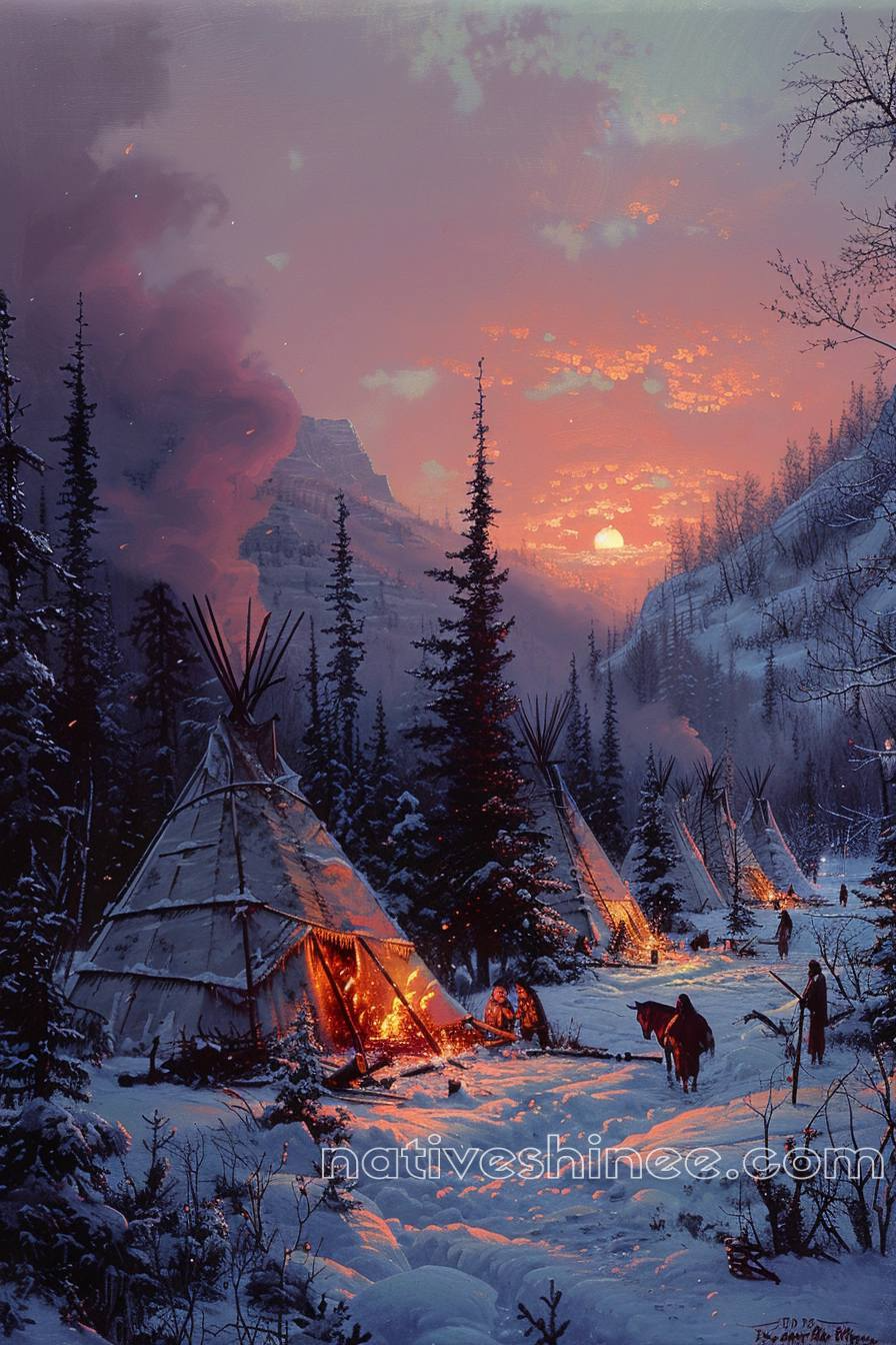 The "Campfires in the Snow Native American Canvas" beautifully portrays a tranquil winter scene where Native American figures gather around glowing campfires amidst a snowy landscape. This artwork symbolizes resilience, warmth, and the sense of community in even the harshest conditions. The soft glow of the fires contrasts with the cool, crisp snow, creating a serene yet powerful atmosphere. Perfect for those who admire Native American culture and the spirit of togetherness, this high-quality canvas adds a touch of warmth, tradition, and peaceful reflection to any home or office décor.