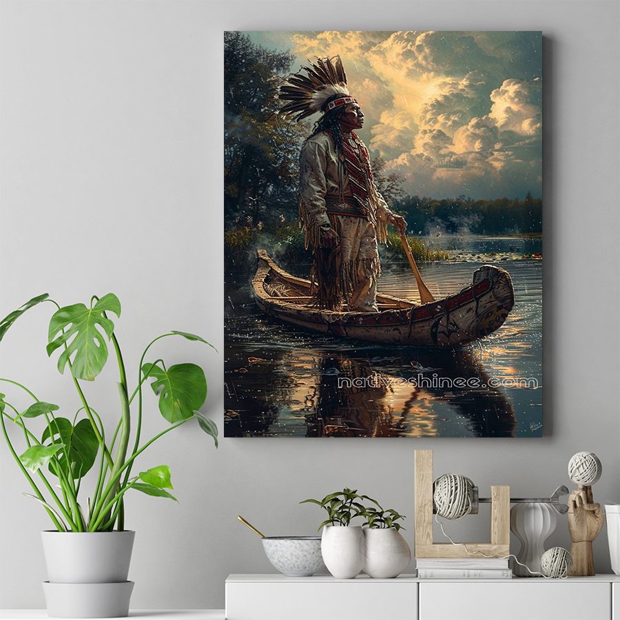The "Canoe of Heritage: Carrying Traditions Forward Native American Canvas" captures a powerful moment as a Native American figure navigates a canoe through calm waters, symbolizing the passage of traditions from one generation to the next. This artwork reflects themes of cultural continuity, wisdom, and the deep connection to nature. The serene water and surrounding landscape enhance the sense of peace and purpose in the journey. With intricate details and rich, natural colors, this high-quality canvas is perfect for those who appreciate Native American heritage, adding a sense of tradition, serenity, and reflection to any home or office space.