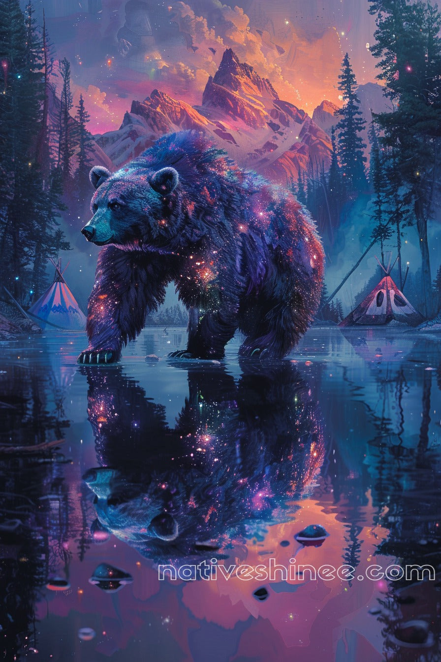 "Canyon Evening Glow" is a captivating canvas print depicting a Native American woman standing at the edge of a deep canyon, her figure silhouetted against a twilight sky of deep purples, soft oranges, and pinks. The woman, adorned in traditional attire with intricate beadwork, feathers, and a fringed dress in warm earth tones, exudes a sense of contemplation and connection to the land, her hair gently stirred by the evening breeze. The landscape features rugged canyon walls, sparse desert shrubs, and a distant horizon bathed in the fading light, creating a serene and majestic atmosphere. The warm hues of the twilight sky contrast beautifully with the cool shadows of the canyon, enhancing the painting’s depth. Displayed above a wooden cabinet with a lush green plant and stacked books, the artwork brings a sense of calm and cultural pride to the room. The detailed textures and soft lighting add emotional resonance.