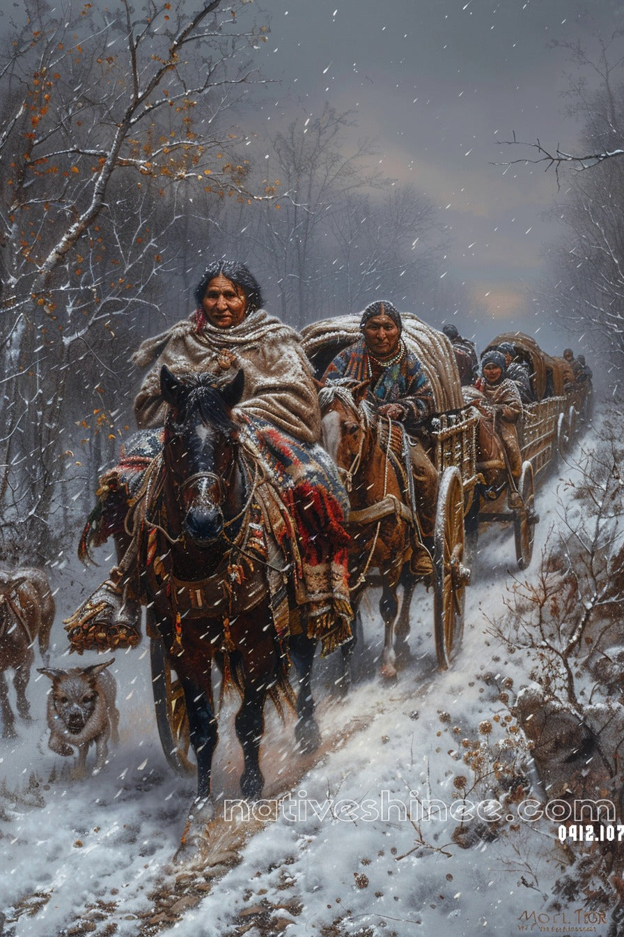 In Caravan of Endurance, a close-knit procession travels through a swirling snowfall, their determination and unity lighting the path of resilience in this Native American Canvas.