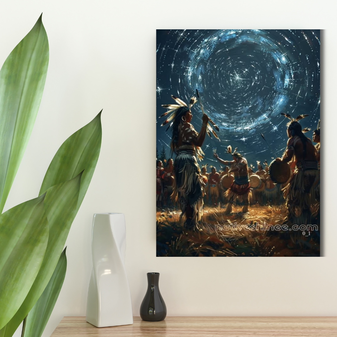 Under a sky alive with swirling constellations, a circle of Native American dancers channel the energy of the universe in a sacred ritual. The rhythmic beats of the drums echo into the cosmos as the dancers, adorned in traditional regalia, connect deeply with the stars above. This mesmerizing artwork captures the harmony between the earth and the heavens, embodying the timeless spirit of Native traditions and cosmic wonder. A celebration of unity, spirituality, and celestial beauty, this is Celestial Dance: The Gathering of Spirits Native American Canvas.