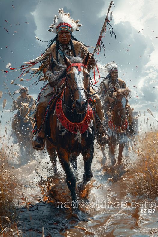 This vibrant artwork captures the commanding presence of Native American warriors riding fiercely through a muddy terrain. At the forefront is a warrior, dressed in traditional regalia, holding a lance and leading his people with pride and strength. The splash of water beneath the horses and the stormy sky in the background create a dynamic and intense atmosphere. The energy of the scene reflects the courage, leadership, and unyielding spirit of Native American culture, echoing the power of nature and the determination of these warriors.