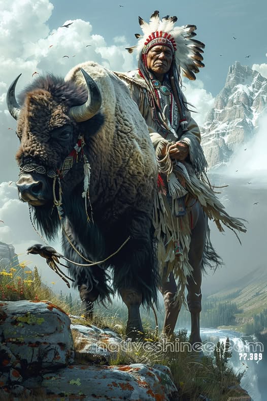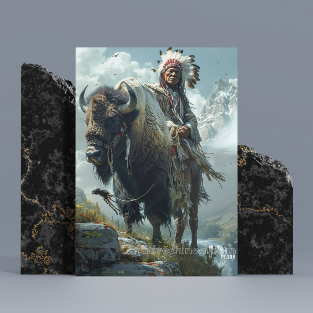 Step into the wilderness with this majestic canvas featuring a Native American chief alongside his powerful buffalo companion. Set against a breathtaking mountain backdrop, this artwork embodies the spirit of the wild and the deep connection between Native American culture and nature. The chief, adorned in traditional attire and a magnificent headdress, stands tall with his buffalo, both symbols of strength, resilience, and wisdom. This stunning piece is a tribute to the heritage and enduring bond between man and animal. Perfect for your home, it brings the untamed beauty of the natural world and the pride of Native American traditions to life.