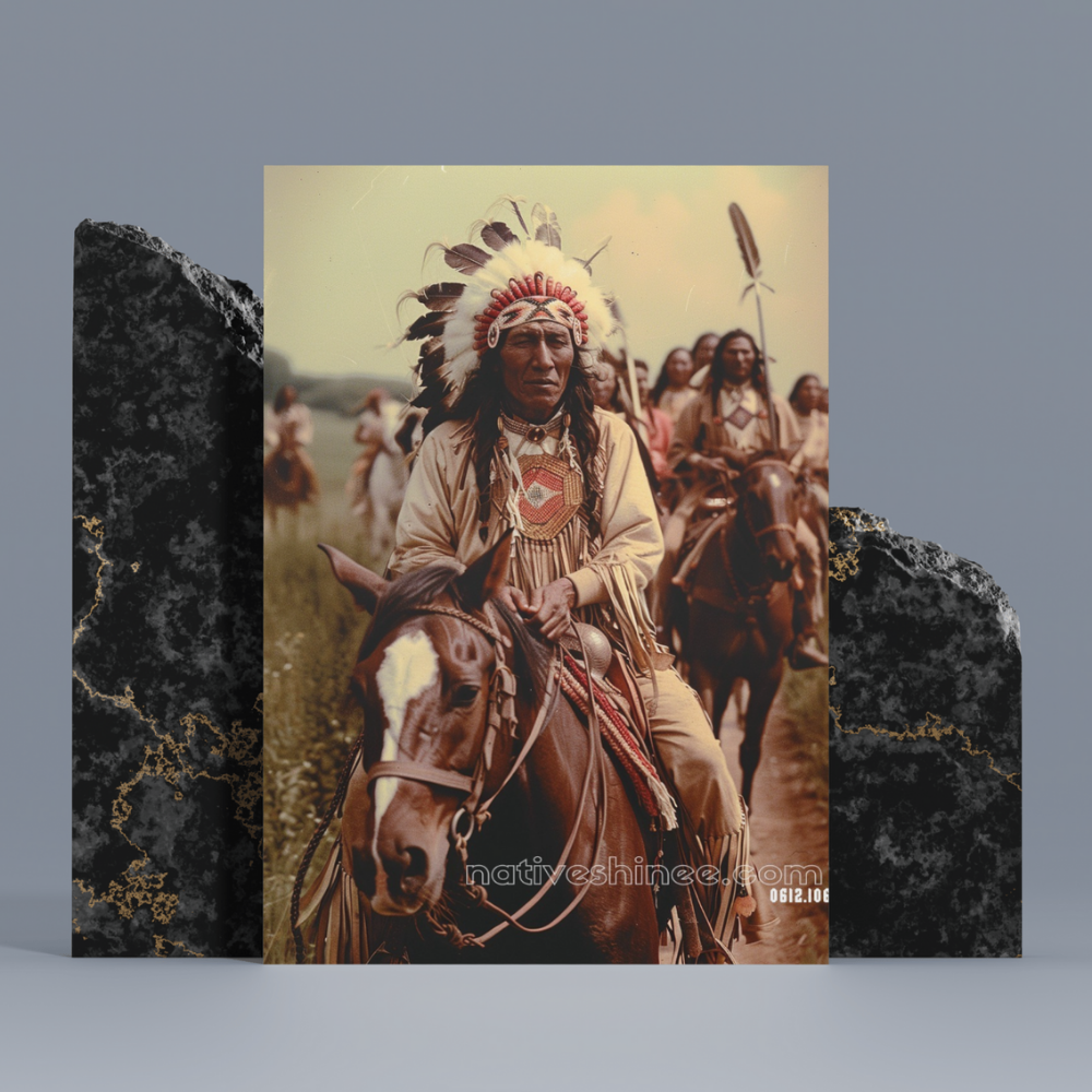 Chief of the Horizon captures the strength and dignity of a Native American leader on horseback, leading his people toward the horizon. Adorned in a traditional headdress and regalia, this warrior stands as a symbol of leadership, wisdom, and resilience. As the leader guides his tribe, the horses carry them through the vast open lands, reflecting the deep connection Native American cultures have with nature and their ancestors. This painting celebrates the spirit of the Native American warrior, honoring the legacy of bravery, honor, and the sacred bond with the earth. Native American Canvas immortalizes the timeless journey of those who lived with honor and deep respect for the land.