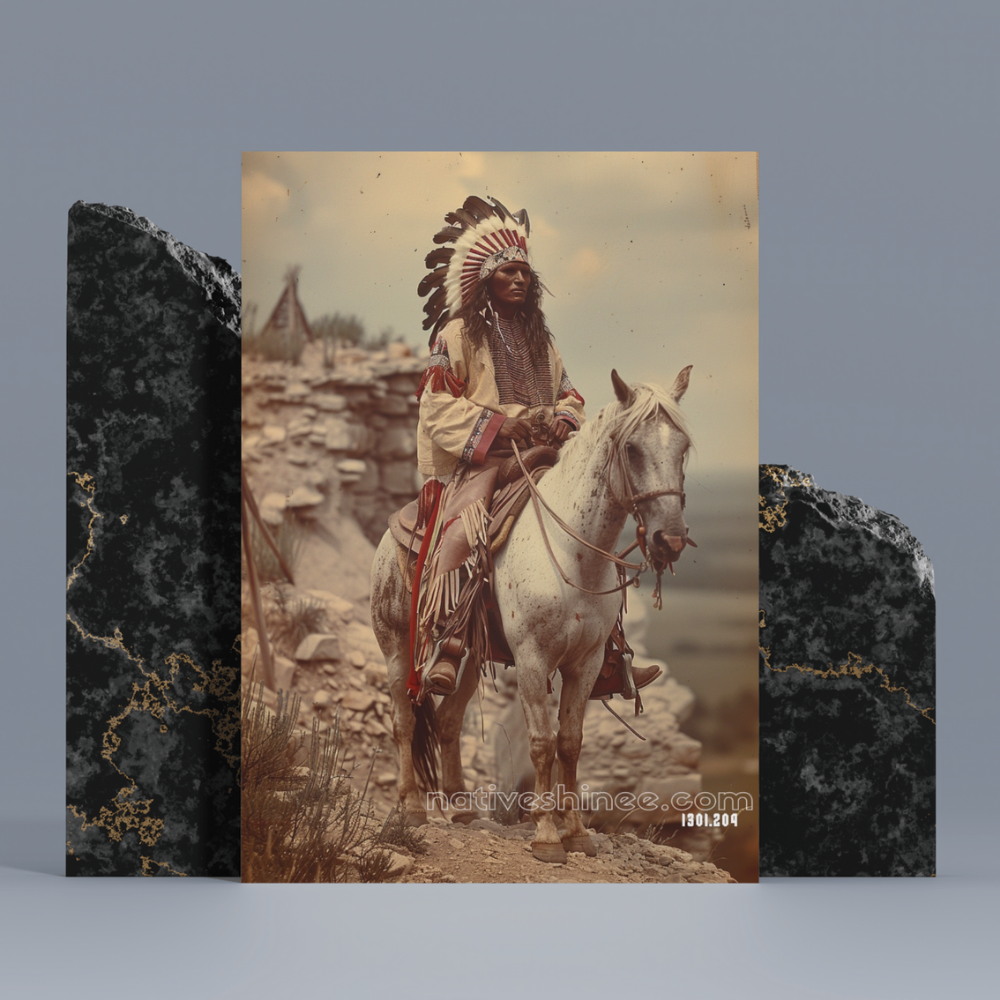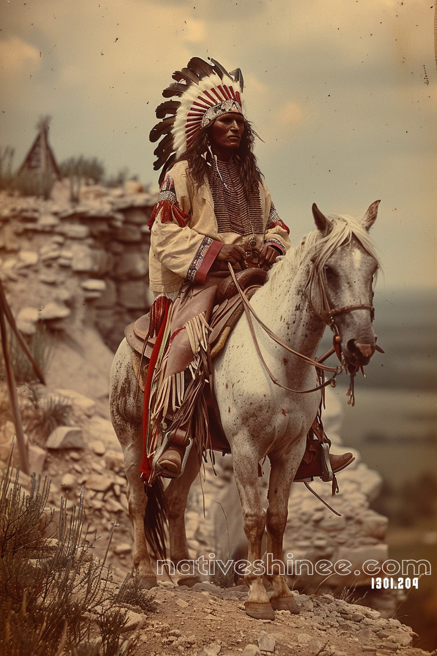 This striking Native American canvas captures the powerful image of a chief atop his white horse, standing proudly on a rocky cliff. Adorned with a vibrant feathered headdress and intricate ceremonial attire, the chief exudes authority and wisdom. The rugged landscape and expansive skies emphasize his deep connection to the land and the responsibilities he carries as a leader. This piece is a tribute to the strength and resilience of Native American culture, making it an ideal addition for those who appreciate the legacy of the warriors and the leaders who shaped history