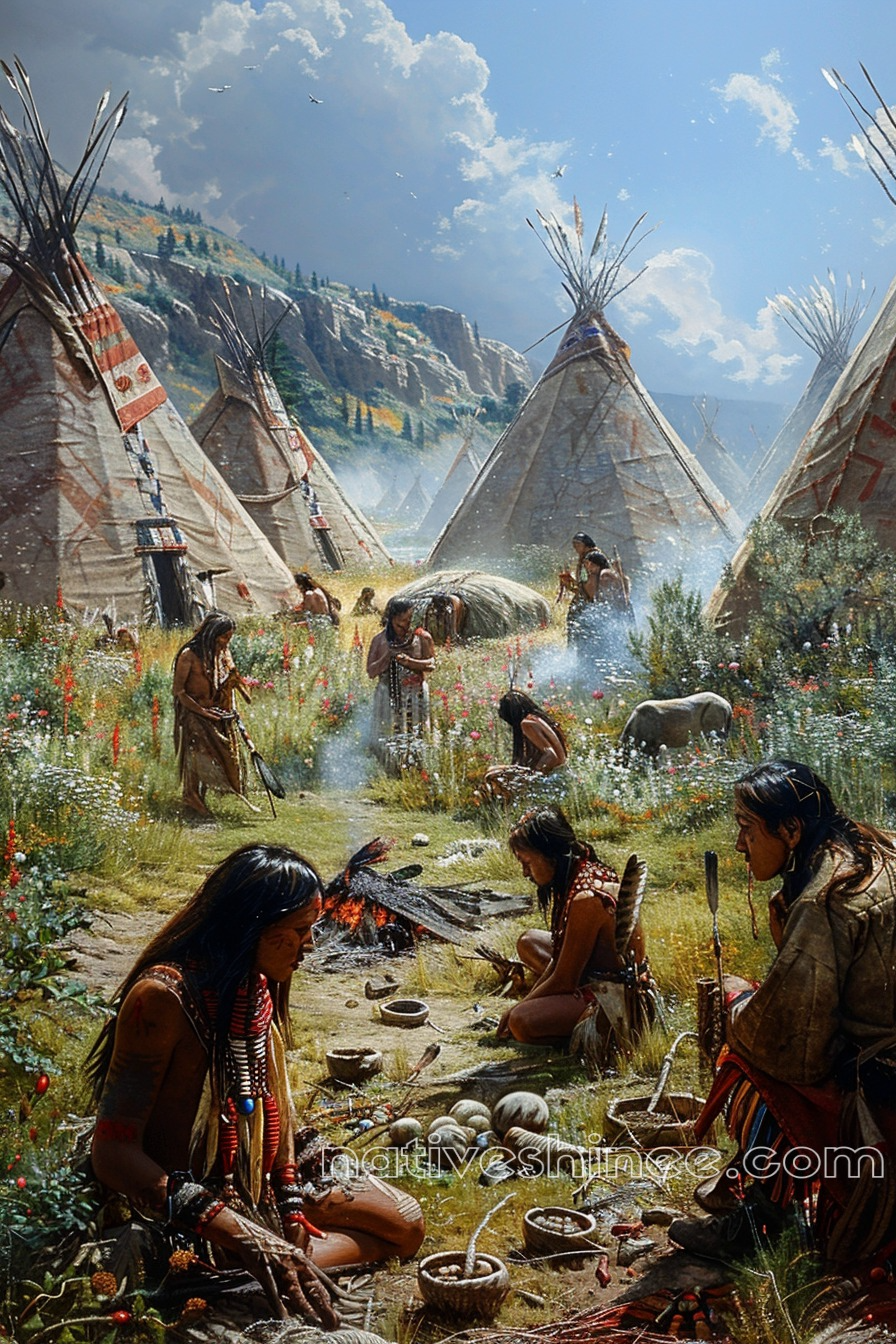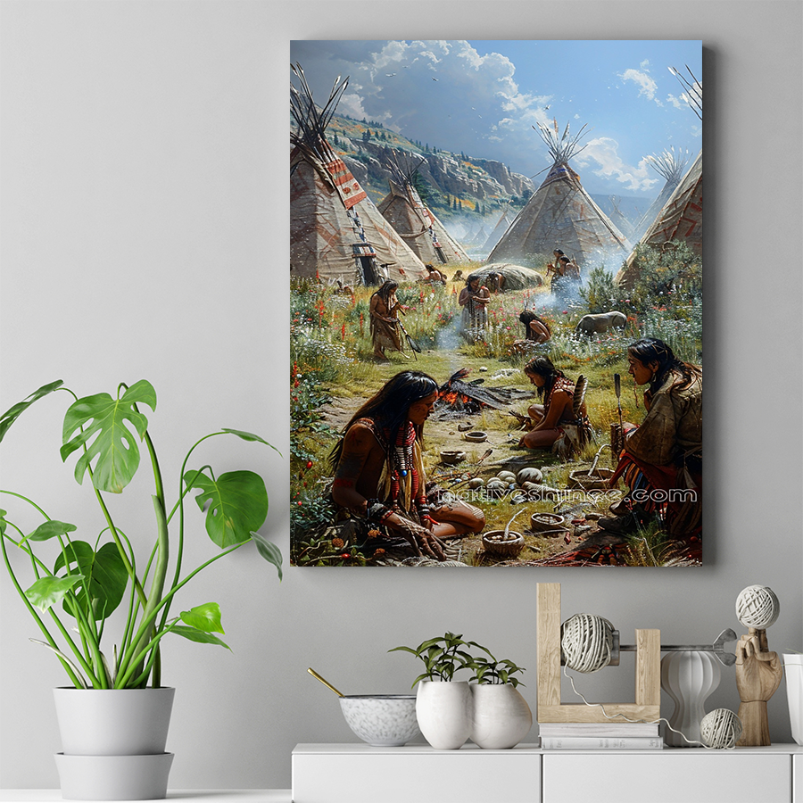 The "Daily Life in a Vibrant Native American Village Canvas" captures the essence of community, tradition, and the lively interactions that define a Native American village. This artwork showcases various aspects of daily life, from children playing to artisans crafting traditional goods, all set against a backdrop of colorful teepees and nature. The rich colors and intricate details reflect the warmth and vibrancy of the culture, celebrating the strong bonds within the community. Perfect for those who appreciate indigenous heritage and the beauty of everyday moments, this high-quality canvas adds warmth, joy, and cultural significance to any home or office décor.