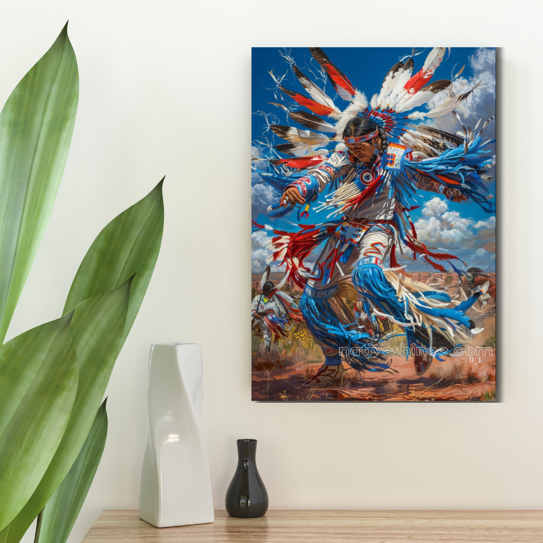 Dance of the Eagle Spirit captures the vibrant energy and profound cultural significance of a Native American dancer in full regalia. Adorned with intricate beadwork, flowing fringes, and majestic eagle feathers, the dancer embodies the grace and power of the eagle, a revered symbol of strength and vision. Set against a backdrop of bright skies and open plains, the movement and colors convey a celebration of tradition, spirituality, and connection to the land. This dynamic artwork is a breathtaking tribute to Native heritage, making it a stunning Native American Canvas
