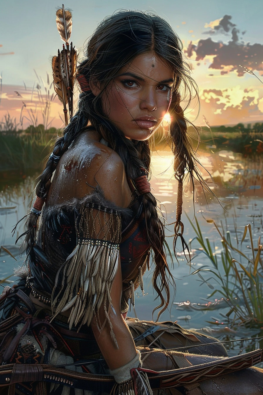 Bathed in the warm glow of a setting sun, a determined young woman kneels by the water’s edge, every beaded tassel and braided strand of hair reflecting her proud heritage. The gentle ripples behind her shimmer with evening light, mirroring the resilient spark in her gaze.