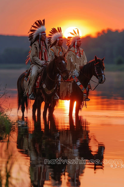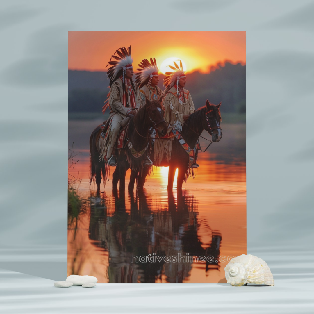 The Dawn’s Promise Native American Canvas brings to life the profound beauty and hope found in the transition between day and night. This stunning artwork features a lone figure standing at the edge of a vast landscape, watching the sunset as it makes way for the first light of a new day. The soft hues of the sky and the serene reflection of the river evoke a sense of peace, while the figure’s pose speaks to both strength and quiet reverence for the cycles of nature.