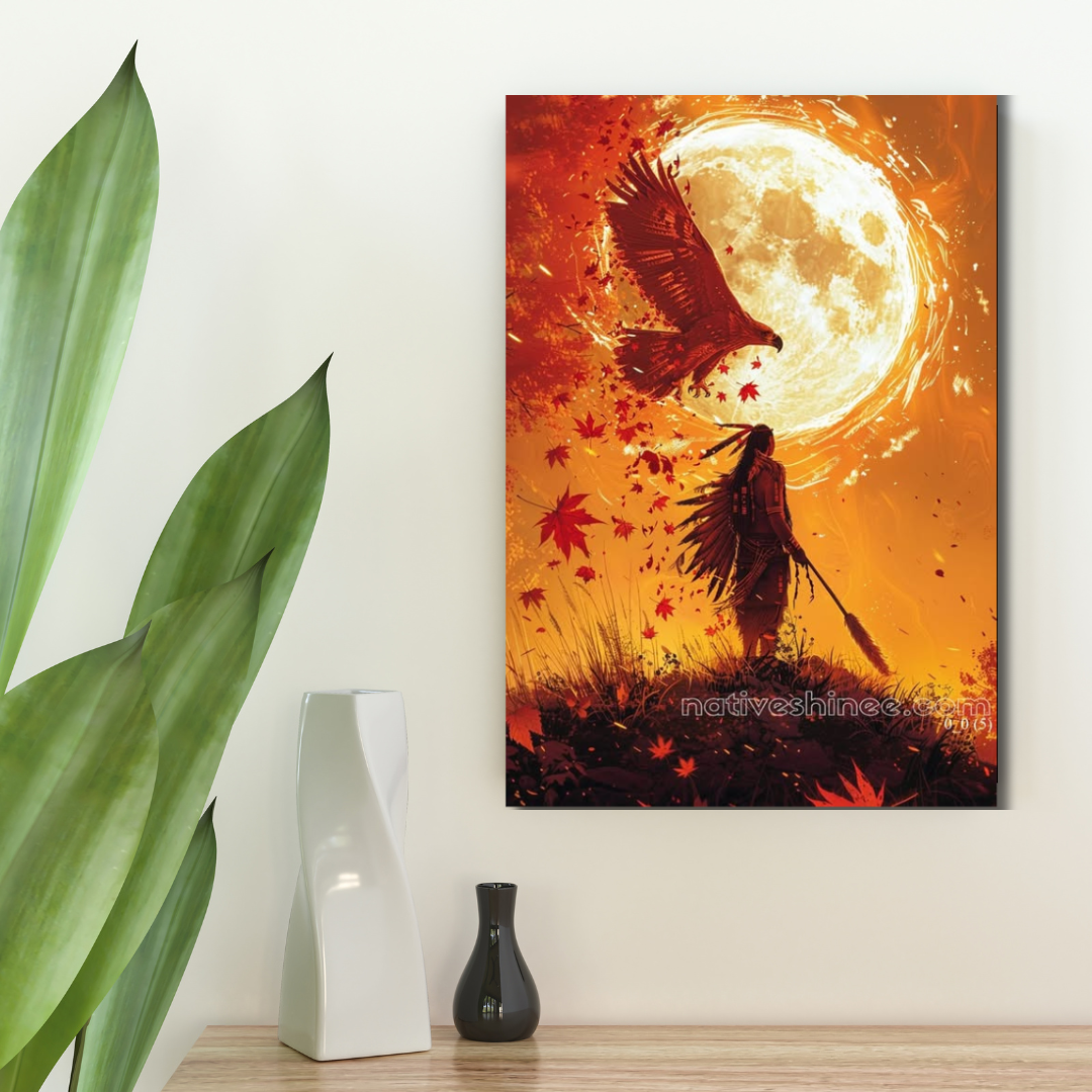 An awe-inspiring image of a Native American figure standing in reverence beneath a luminous full moon, surrounded by the fiery hues of autumn leaves. An eagle soars majestically above, symbolizing freedom and spiritual guidance, as the figure holds a ceremonial staff, embodying strength and connection to the spirit world. The vibrant interplay of warm colors and natural elements creates a sense of mysticism and harmony. A radiant Native American Canvas.