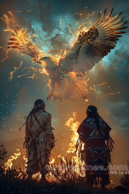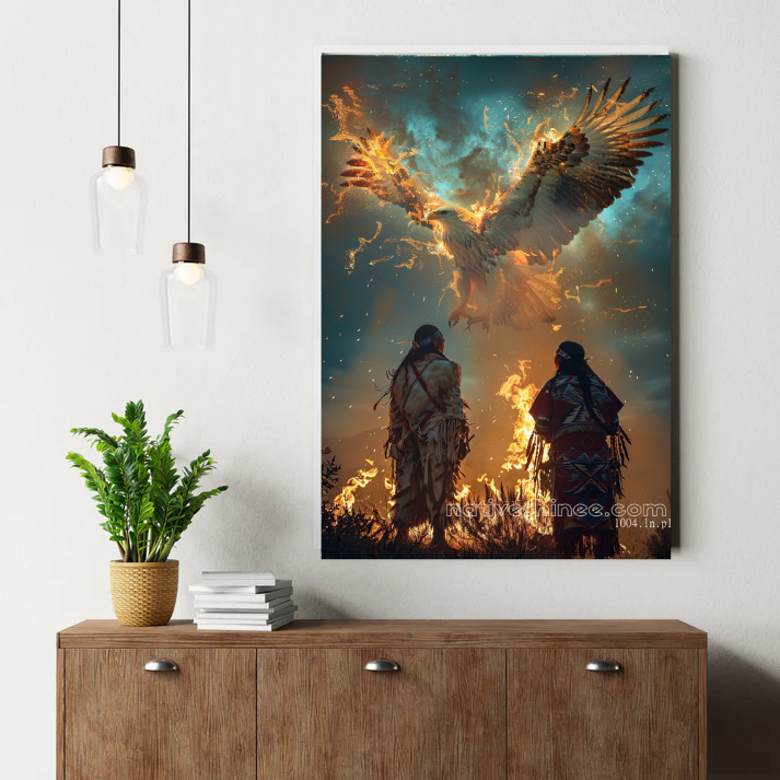 Ignite your space with the power of tradition and nature with our Eagle Rising Canvas! This dramatic canvas print captures two Native American figures in traditional attire, standing by a blazing fire as a majestic eagle rises from the flames, set against a fiery, mystical sky that radiates energy and spirituality. Perfect for those who admire cultural heritage and the symbolic beauty of nature, this artwork adds a bold and inspiring touch to any space. Printed on high-quality canvas, it showcases vibrant colors and intricate details, ensuring a lasting and impactful display. Ideal for hanging in your living room, office, or spiritual space, this canvas print brings the transformative spirit of a Native-inspired eagle rising from the fire into your home, making it a captivating focal point for your decor.