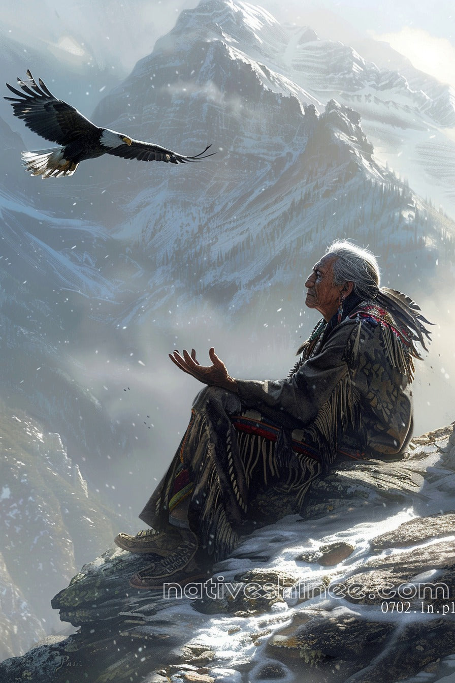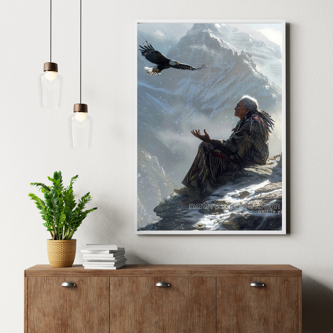 Connect with the wisdom of the ancients through this mesmerizing canvas art, Eagle Spirit Vision Native American Canvas. Depicting an elder Native American man, draped in traditional attire, reaching out to an eagle soaring high above the majestic mountain peaks, this artwork embodies spiritual connection, guidance, and the deep respect for the natural world. The peaceful yet powerful scene captures the harmony between the elder and the eagle, symbolizing strength, freedom, and vision. Perfect for those who honor Native American spirituality, this piece will bring tranquility and empowerment to any space.