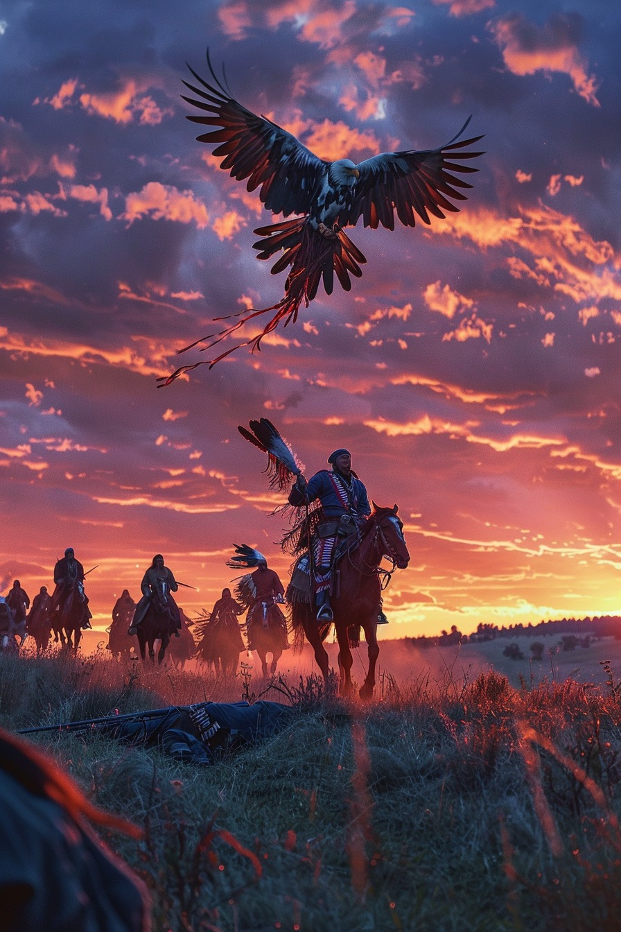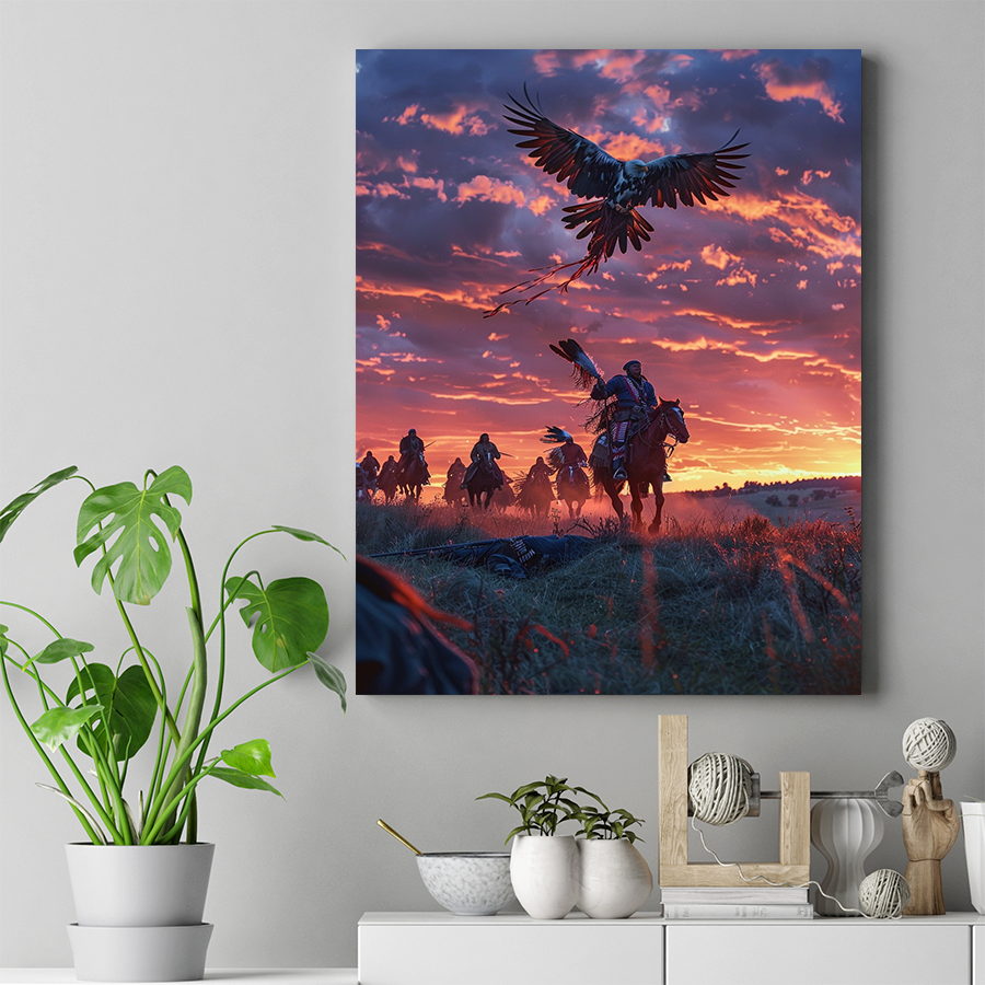 The "Eagle's Call at Sunset Native American Canvas" beautifully captures a majestic eagle soaring across a vibrant sunset sky, its powerful call resonating through the landscape. This artwork symbolizes freedom, vision, and a spiritual connection to the land, with the warm colors of the setting sun creating a striking backdrop. The scene evokes a sense of peace, strength, and reverence, highlighting the eagle as a revered figure in Native American culture. Perfect for those who appreciate the symbolism of the eagle and the beauty of nature, this high-quality canvas adds inspiration, warmth, and cultural significance to any home or office décor.