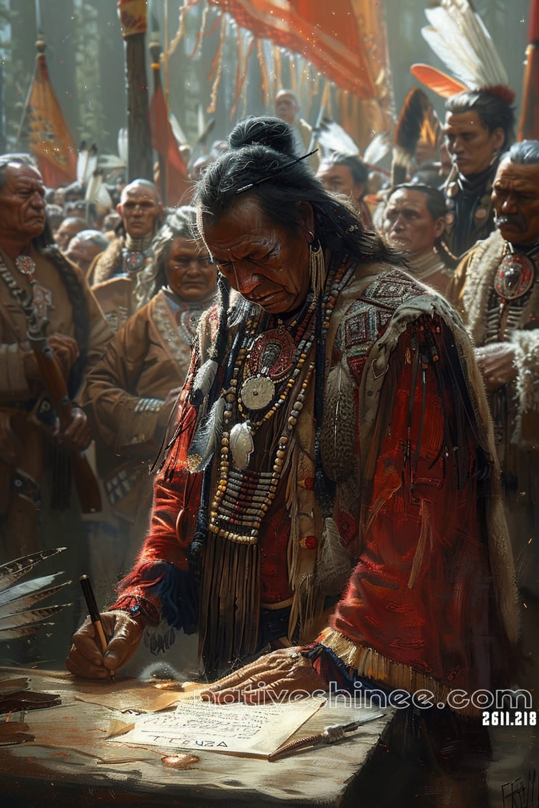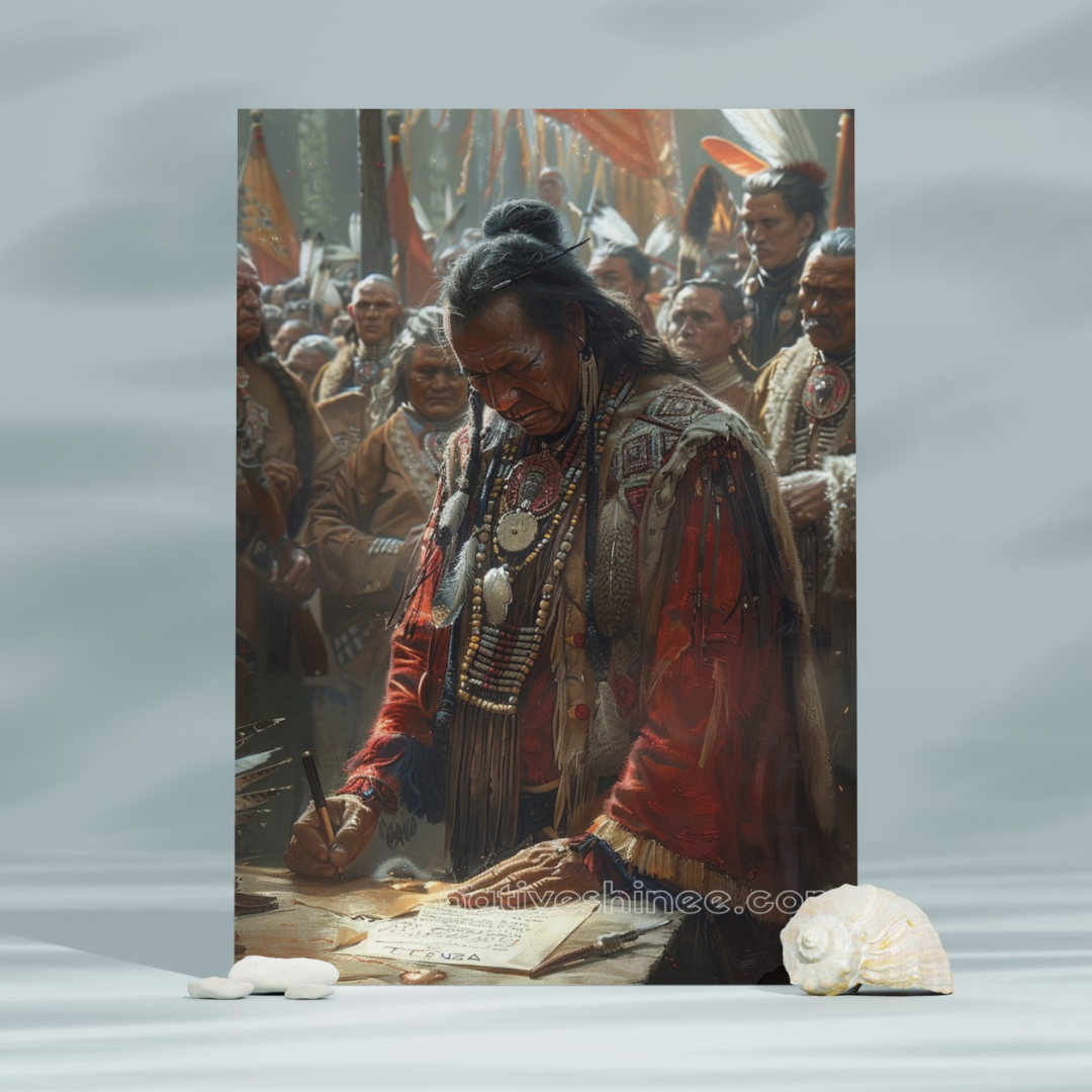 The Echoes of Betrayal Native American Canvas captures the solemn weight of broken promises and the deep sorrow of what was lost. This artwork symbolizes the ink of betrayal—the agreements that were once signed in good faith but were dishonored, leaving a lasting scar on the land and its people.