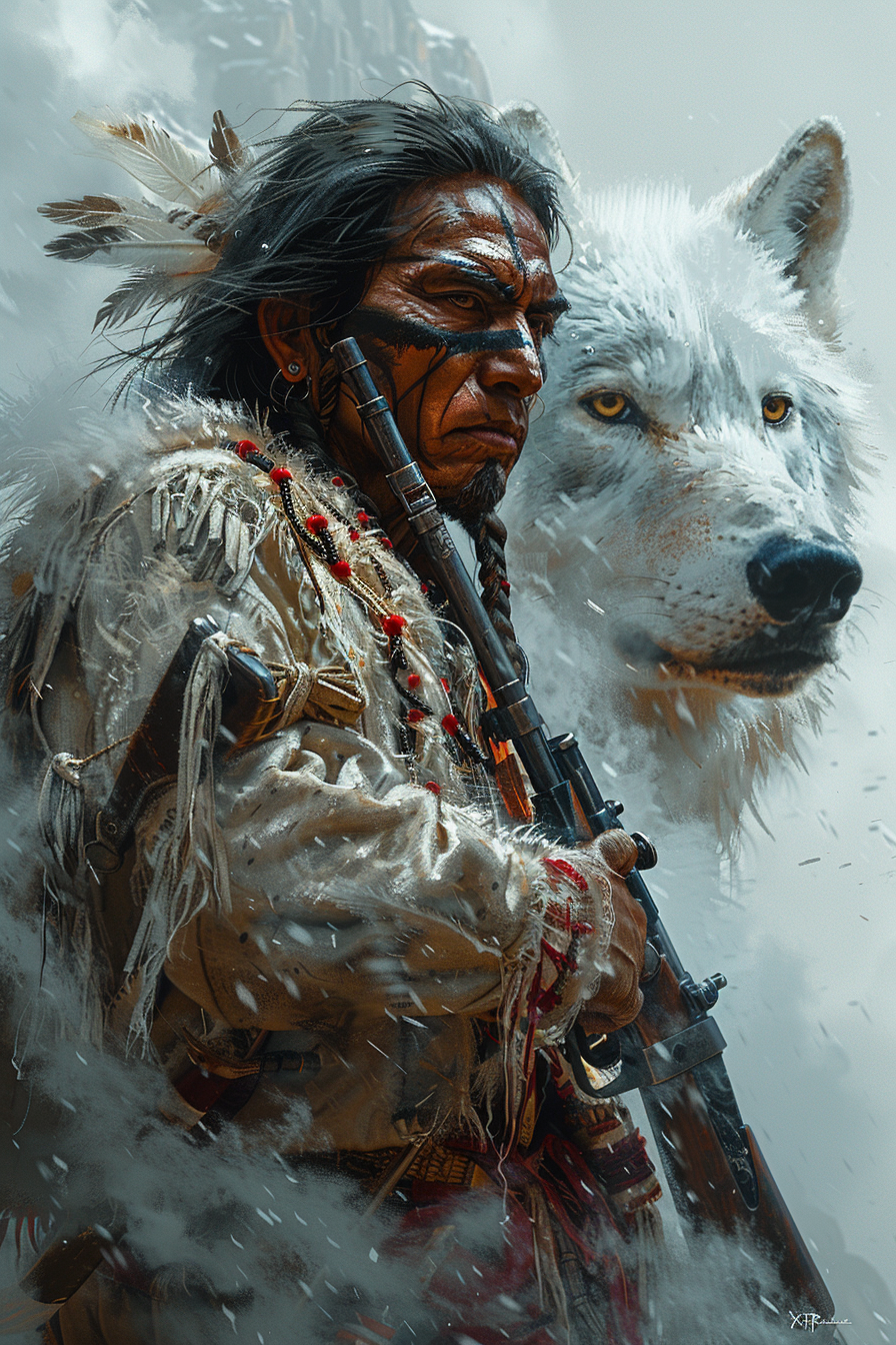 The "Echoes of the Ancestors: The Warrior and the Wolf Native American Canvas" presents a powerful and intimate scene of a Native American warrior and a wolf, symbolizing strength, loyalty, and ancestral connection. The warrior and wolf stand side by side, embodying a bond that reflects the harmony between humanity and nature. With intricate detailing and earthy tones, this artwork resonates with the spiritual legacy and wisdom of past generations. Ideal for those who admire Native American culture and the symbolism of the wolf, this high-quality canvas brings inspiration, depth, and cultural pride to any home or office décor.