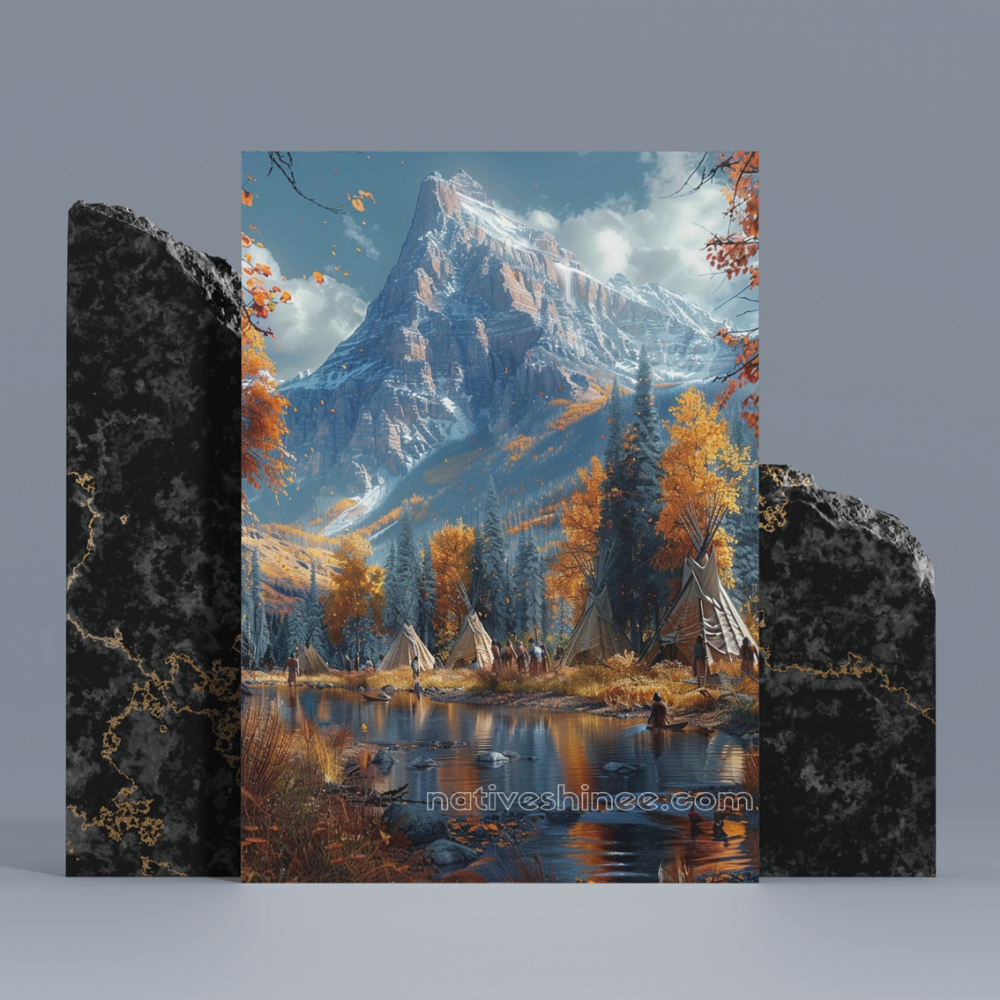 This stunning artwork captures the timeless beauty of a Native American village nestled at the foot of a majestic snow-capped mountain. The golden hues of fall foliage reflect in the calm river as the community moves through the land, honoring the spirit of nature. The peaceful presence of the tepees and people emphasizes the deep connection between the land and its inhabitants, creating an atmosphere of calm and respect.