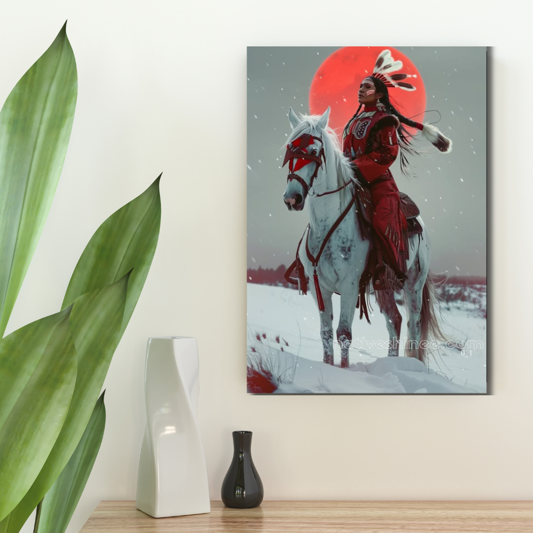 Amid a snow-covered landscape, a powerful warrior sits astride a majestic white horse, their red regalia contrasting boldly against the pale winter scene. The crimson moon looms large in the background, casting an ethereal glow that symbolizes strength, determination, and the timeless connection to the celestial world. This evocative image captures the resilience and spirit of the Native people, creating an unforgettable Native American Canvas.