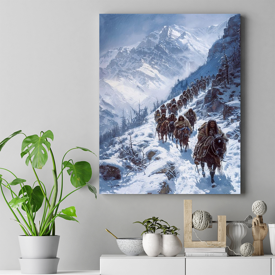Echoes of the Trail: A Snowbound Path Native American Canvas