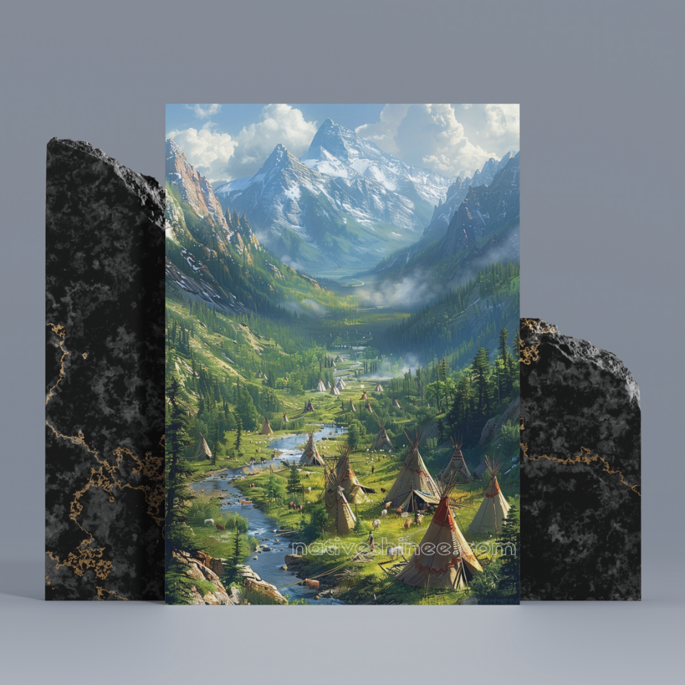 This breathtaking canvas transports you to a lush valley, where towering mountains frame a peaceful Native American village. The colorful teepees, the gentle flow of the river, and the presence of the indigenous people create an aura of serenity and connection to the land. The vibrant greens of the trees and the snowy mountain tops symbolize the harmony between nature and the people who live within it.