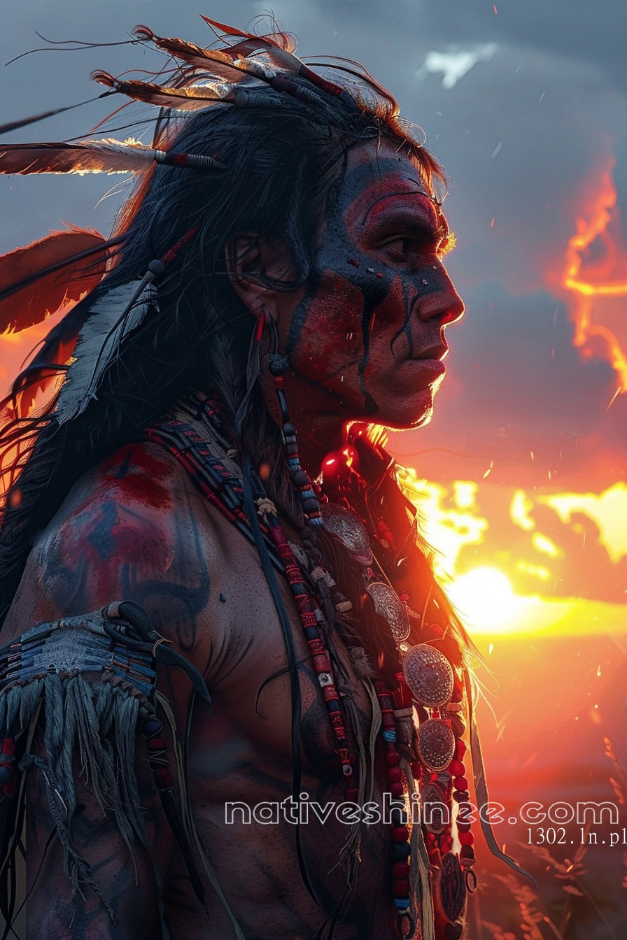 This powerful image showcases a Native American warrior standing tall against a stunning sunset backdrop. The warrior is adorned with intricate beadwork and colorful feathers, a reflection of cultural pride and tradition. Their face is painted with striking red and black markings, symbolizing strength and heritage. The body is decorated with ceremonial beads and jewelry, further emphasizing the connection to ancestral roots. The lighting casts a warm glow, enhancing the dramatic effect, while the wind seems to sweep through the warrior's hair and feathers, creating a sense of motion and intensity.