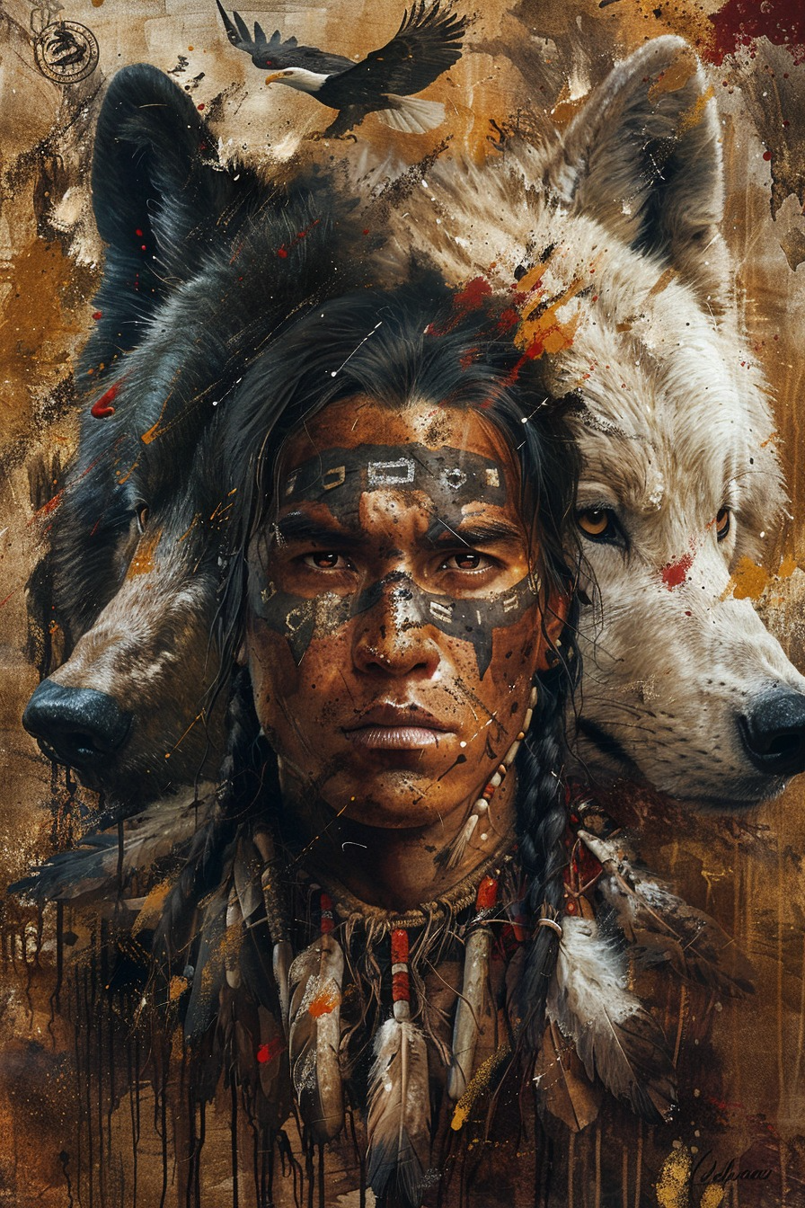 The "Embodying Strength and Spirit Native American Canvas" beautifully captures a powerful moment of resilience and inner strength, reflecting the indomitable spirit of Native American heritage. This artwork depicts a figure standing tall and centered within a natural landscape, symbolizing a profound connection to culture, tradition, and the land. With rich, earthy tones and detailed artistry, the canvas exudes a sense of reverence, pride, and spiritual grounding. Ideal for those who appreciate Native American culture and the beauty of strength through tradition, this high-quality canvas brings depth, inspiration, and cultural significance to any home or office décor.