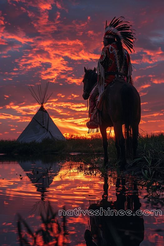 This mesmerizing canvas portrays a Native American warrior on horseback, silhouetted against a fiery sunset. The rich red and orange hues of the sky are reflected in the calm waters below, creating a moment of harmony between earth and sky. Behind the warrior, a lone teepee stands, symbolizing the connection to home and tradition. The quiet strength of the scene evokes feelings of peace, honor, and reverence for the land. This image captures a sacred moment of reflection and guardianship, as the warrior gazes over the horizon, enveloped by the beauty and power of nature’s twilight.
