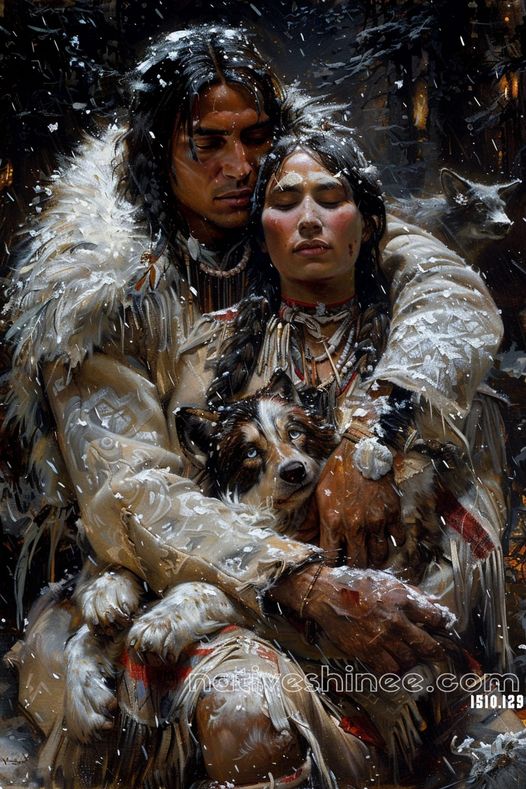 Amidst a gentle snowfall, a couple dressed in traditional Native American winter attire finds solace in each other’s arms. The scene exudes love and protection as they shield their loyal dog, its eyes reflecting trust and devotion. Snowflakes settle softly on their fur-lined garments, adding to the ethereal glow of the moment. This intimate portrayal captures the strength of family and the bond between humans, nature, and their faithful animal companions.