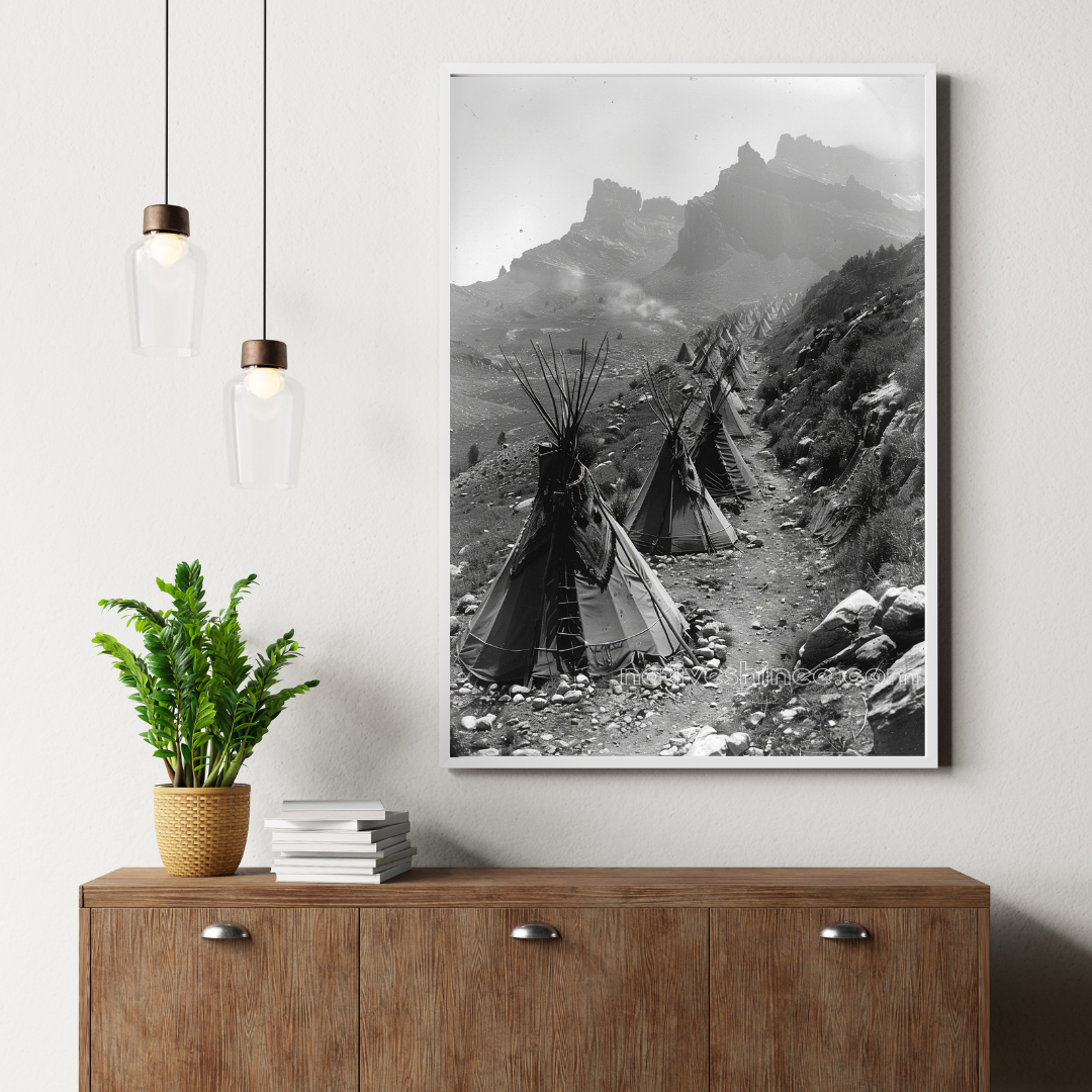 A vast Cheyenne encampment stretches along a rugged mountain path, its rows of tipis blending into the stark and dramatic landscape. Smoke rises faintly from distant fires, dissipating into the cold mountain air, while towering rock formations loom over the settlement like silent guardians. The black-and-white tones evoke a sense of timelessness, as if capturing a moment of resilience and survival in the face of an ever-changing world. The intricate beadwork and woven decorations on the tipis hint at the cultural depth and artistry of the people who once thrived here, living in harmony with the land