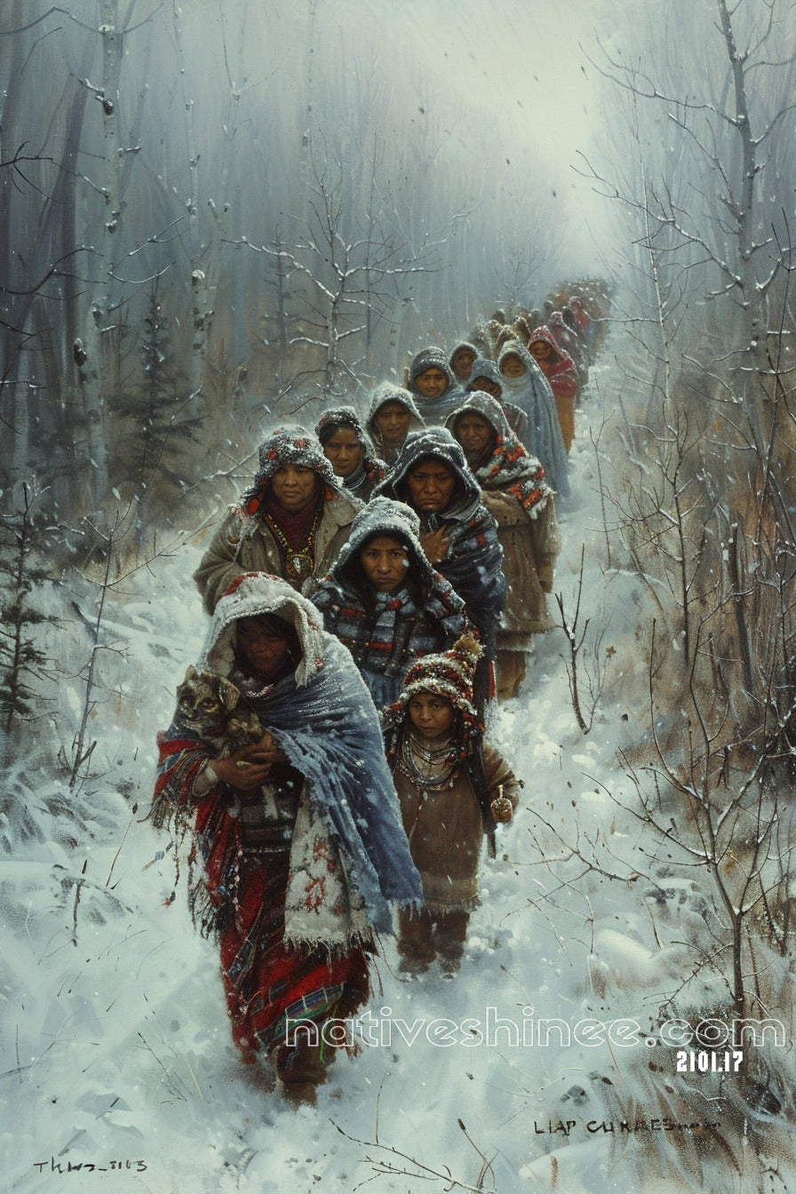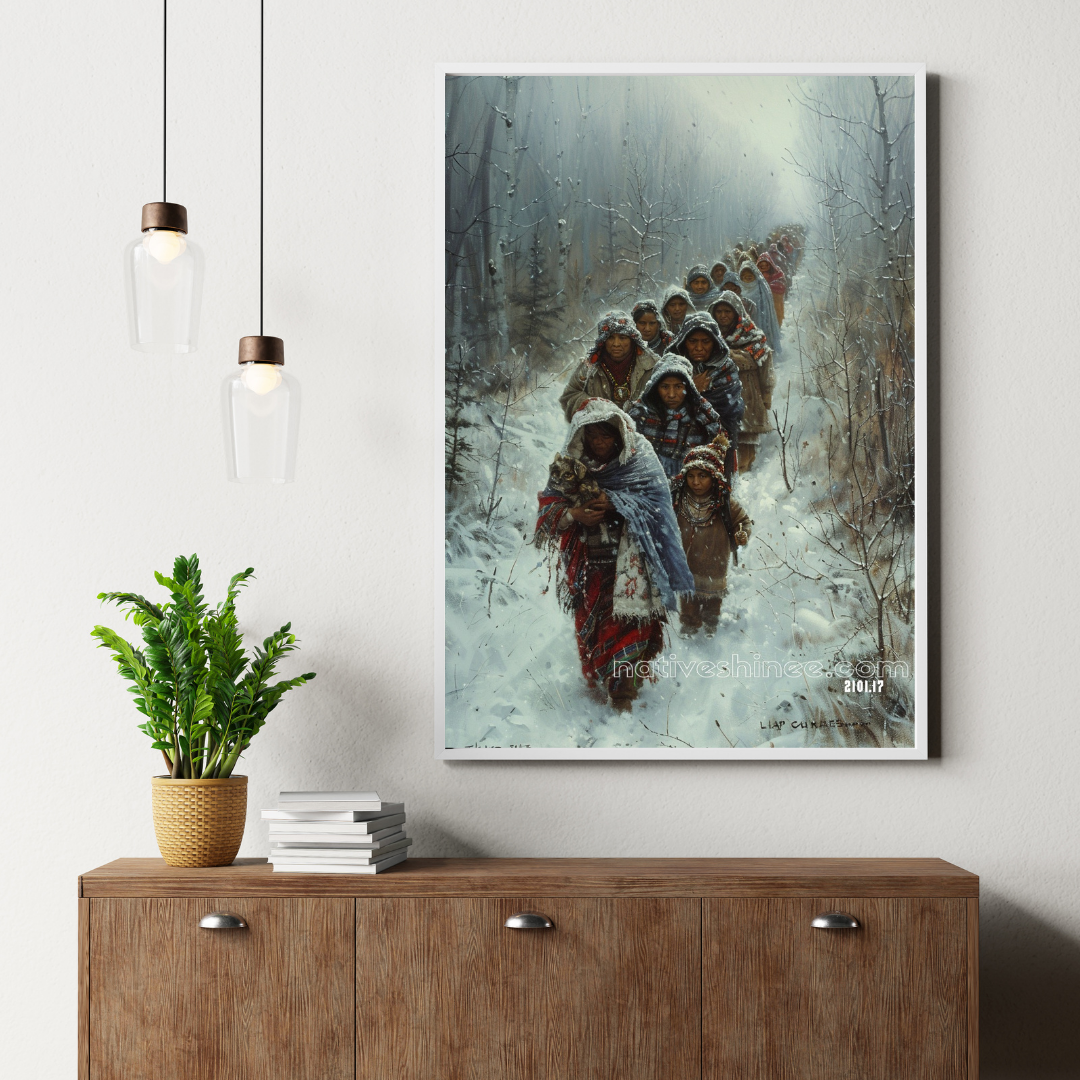 Witness the strength and endurance of Native American culture with this powerful artwork, depicting a group of resilient women and children walking through the snow. Their faces, wrapped in the warmth of their shawls, reflect the hardship and unity of the journey. As they trek through the harsh winter landscape, each step symbolizes the perseverance and deep connection to their ancestors. Printed on high-quality, durable canvas, this artwork adds depth and meaning to any space. Embrace the spirit of resilience and community with this Native American Canvas – order now.
