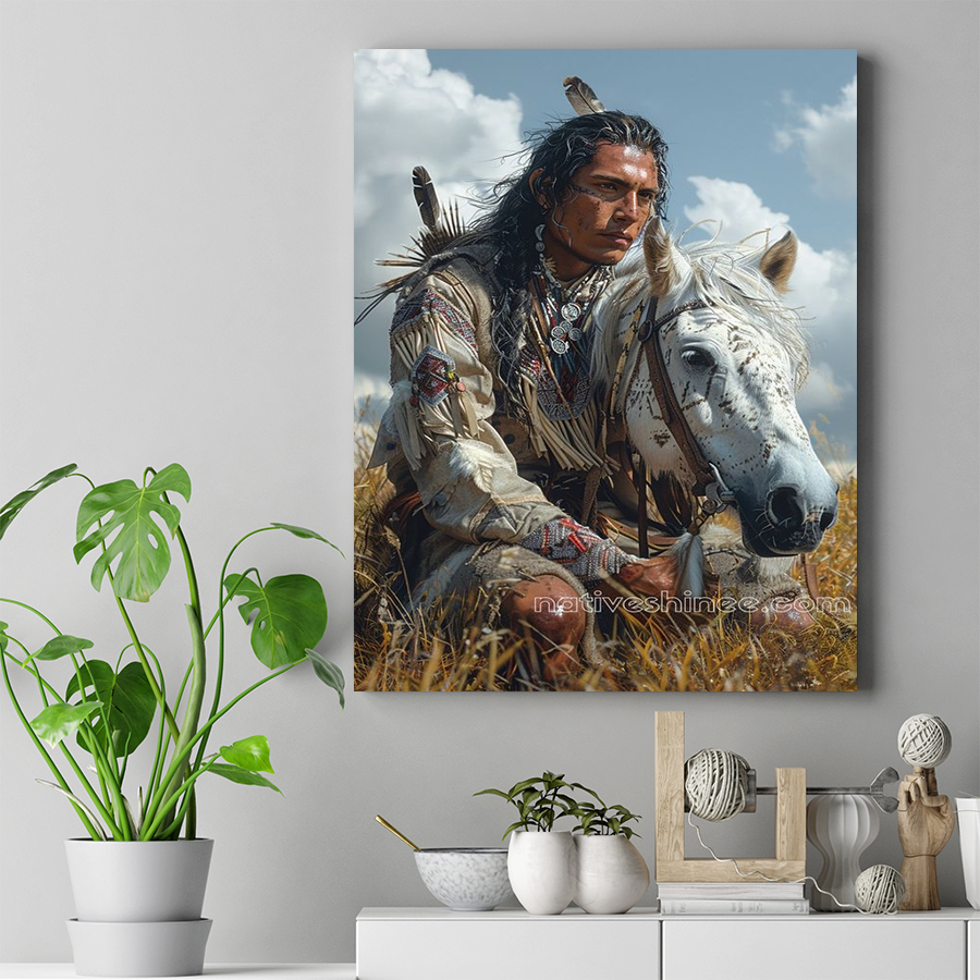 The "Enduring Friendship Under the Sky Native American Canvas" beautifully celebrates the timeless bond of friendship within Native American culture. This artwork features two figures standing side by side beneath an expansive sky, symbolizing loyalty, shared strength, and mutual support. Soft, earthy tones and intricate detailing bring warmth to the scene, capturing the spirit of connection and unity with nature and one another. Ideal for those who appreciate the values of companionship and cultural heritage, this high-quality canvas adds warmth, inspiration, and a touch of heartfelt meaning to any home or office décor.