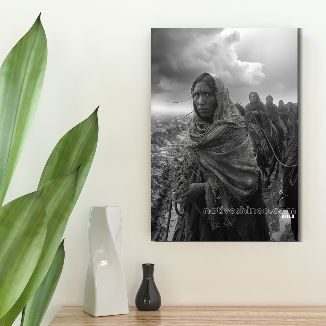 Enduring Spirit Native American Canvas captures the resilience and determination etched in the faces of a group traveling through a desolate, windswept landscape. The monochromatic tones emphasize the gravity of their journey, evoking stories of survival, unity, and ancestral strength. This striking image pays homage to the enduring spirit of Native American heritage, making it a profound and evocative Native American Canvas.